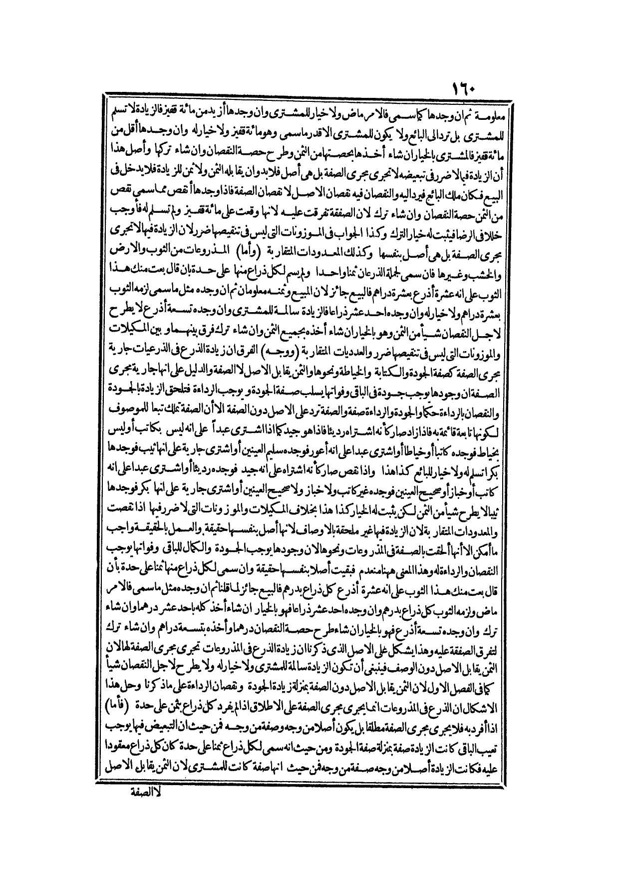 مَعْلُومَةٌ ثُمَّ إنْ وَجَدَهَا كَمَا سَمَّى فَالْأَمْرُ مَاضٍ وَلَا خِيَارَ لِلْمُشْتَرِي وَإِنْ وَجَدَهَا أَزْيَدَ مِنْ مِائَةِ قَفِيزٍ فَالزِّيَادَةُ لَا تُسَلَّمُ لِلْمُشْتَرِي بَلْ تُرَدُّ إلَى الْبَائِعِ وَلَا يَكُونُ لِلْمُشْتَرِي إلَّا قَدْرُ مَا سَمَّى وَهُوَ مِائَةُ قَفِيزٍ وَلَا خِيَارَ لَهُ وَإِنْ وَجَدَهَا أَقَلَّ مِنْ مِائَةِ قَفِيزٍ فَالْمُشْتَرِي بِالْخِيَارِ إنْ شَاءَ أَخَذَهَا بِحِصَّتِهَا مِنْ الثَّمَنِ وَطَرَحَ حِصَّةَ النُّقْصَانِ وَإِنْ شَاءَ تَرَكَهَا وَأَصْلُ هَذَا أَنَّ الزِّيَادَةَ فِيمَا لَا ضَرَرَ فِي تَبْعِيضِهِ لَا تَجْرِي مَجْرَى الصِّفَةِ بَلْ هِيَ أَصْلٌ فَلَا بُدَّ وَأَنْ يُقَابِلَهُ الثَّمَنُ، وَلَا ثَمَنَ لِلزِّيَادَةِ فَلَا يَدْخُلُ فِي الْبَيْعِ فَكَانَ مِلْكَ الْبَائِعِ فَيُرَدُّ إلَيْهِ، وَالنُّقْصَانُ فِيهِ نُقْصَانُ الْأَصْلِ لَا نُقْصَانُ الصِّفَةِ فَإِذَا وَجَدَهَا أَنْقَصَ مِمَّا سَمَّى؛ نَقَصَ مِنْ الثَّمَنِ حِصَّةَ النُّقْصَانِ وَإِنْ شَاءَ تَرَكَ؛ لِأَنَّ الصَّفْقَةَ تَفَرَّقَتْ عَلَيْهِ؛ لِأَنَّهَا وَقَعَتْ عَلَى مِائَةِ قَفِيزٍ وَلَمْ تُسَلَّمْ لَهُ فَأَوْجَبَ خَلَلًا فِي الرِّضَا فَيَثْبُتُ لَهُ خِيَارُ التَّرْكِ وَكَذَا الْجَوَابُ فِي الْمَوْزُونَاتِ الَّتِي لَيْسَ فِي تَنْقِيصِهَا ضَرَرٌ؛ لِأَنَّ الزِّيَادَةَ فِيهَا لَا تَجْرِي مَجْرَى الصِّفَةِ بَلْ هِيَ أَصْلٌ بِنَفْسِهَا وَكَذَلِكَ الْمَعْدُودَاتُ الْمُتَقَارِبَةُ.