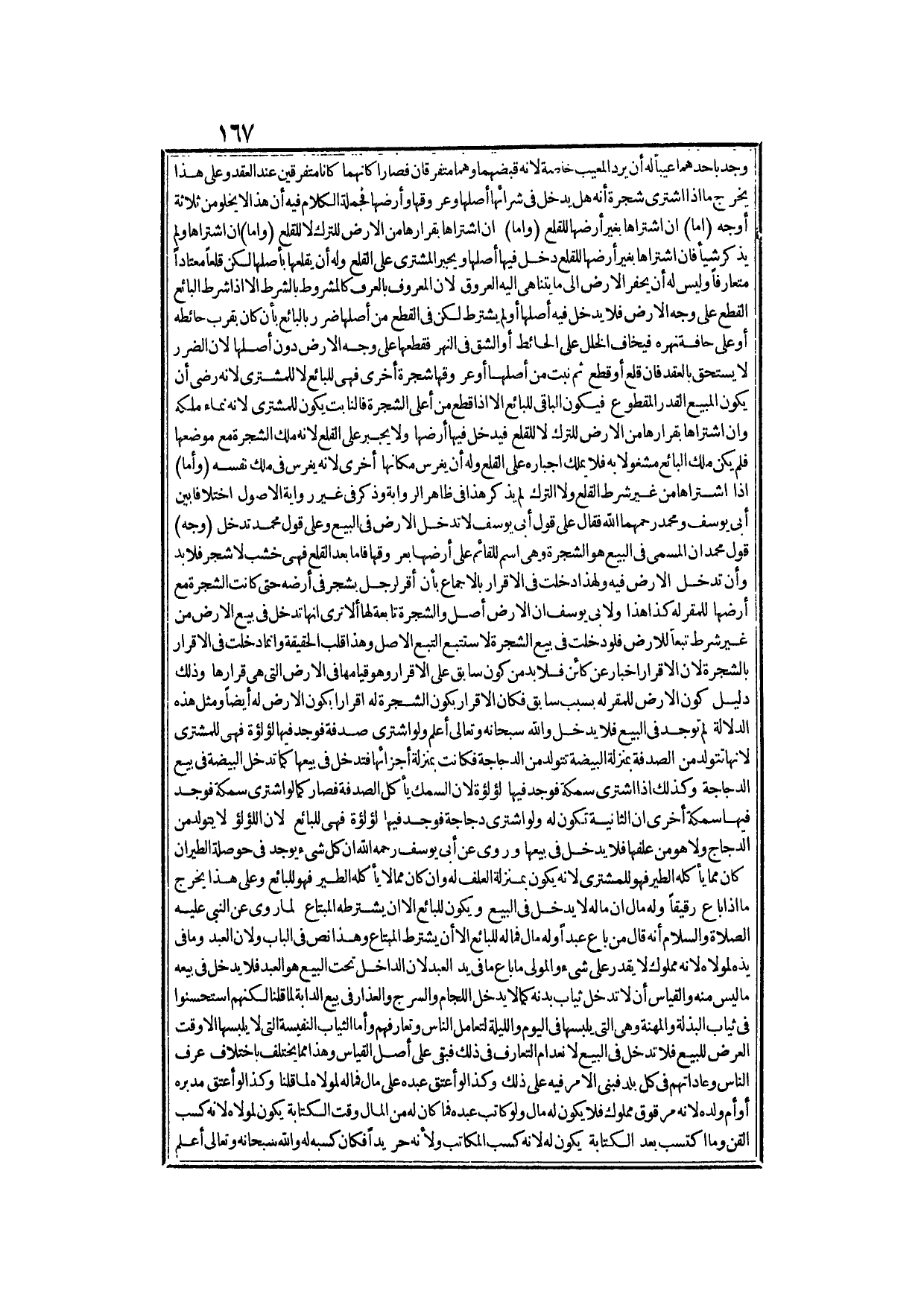 (وَجْهُ) قَوْلِ مُحَمَّدٍ أَنَّ الْمُسَمَّى فِي الْبَيْعِ هُوَ الشَّجَرَةُ وَهِيَ اسْمٌ لِلْقَائِمِ عَلَى أَرْضِهَا بِعُرُوقِهَا فَأَمَّا بَعْدَ الْقَلْعِ فَهِيَ خَشَبٌ لَا شَجَرٌ فَلَا بُدَّ وَأَنْ تَدْخُلَ الْأَرْضُ فِيهِ؛ وَلِهَذَا دَخَلَتْ فِي الْإِقْرَارِ بِالْإِجْمَاعِ بِأَنْ أَقَرَّ لِرَجُلٍ بِشَجَرٍ فِي أَرْضِهِ حَتَّى كَانَتْ الشَّجَرَةُ مَعَ أَرْضِهَا لِلْمُقَرِّ لَهُ كَذَا هَذَا وَلِأَبِي يُوسُفَ أَنَّ الْأَرْضَ أَصْلٌ وَالشَّجَرَةَ تَابِعَةٌ لَهَا؛ أَلَا تَرَى أَنَّهَا تَدْخُلُ فِي بَيْعِ الْأَرْضِ مِنْ غَيْرِ شَرْطٍ تَبَعًا لِلْأَرْضِ؟ فَلَوْ دَخَلَتْ فِي بَيْعِ الشَّجَرَةِ لَاسْتَتْبَعَ التَّبَعُ الْأَصْلَ وَهَذَا قَلْبُ الْحَقِيقَةِ وَإِنَّمَا دَخَلَتْ فِي الْإِقْرَارِ بِالشَّجَرَةِ؛ لِأَنَّ الْإِقْرَارَ إخْبَارٌ عَنْ كَائِنٍ فَلَا بُدَّ مِنْ كَوْنٍ سَابِقٍ عَلَى الْإِقْرَارِ وَهُوَ قِيَامُهَا فِي الْأَرْضِ الَّتِي هِيَ قَرَارُهَا وَذَلِكَ دَلِيلُ كَوْنِ الْأَرْضِ لِلْمُقَرِّ لَهُ بِسَبَبٍ سَابِقٍ فَكَانَ الْإِقْرَارُ بِكَوْنِ الشَّجَرَةِ لَهُ إقْرَارًا بِكَوْنِ الْأَرْضِ لَهُ أَيْضًا، وَمِثْلُ هَذِهِ الدَّلَالَةِ لَمْ تُوجَدْ فِي الْبَيْعِ فَلَا يَدْخُلُ وَاَللَّهُ سُبْحَانَهُ وَتَعَالَى أَعْلَمُ.