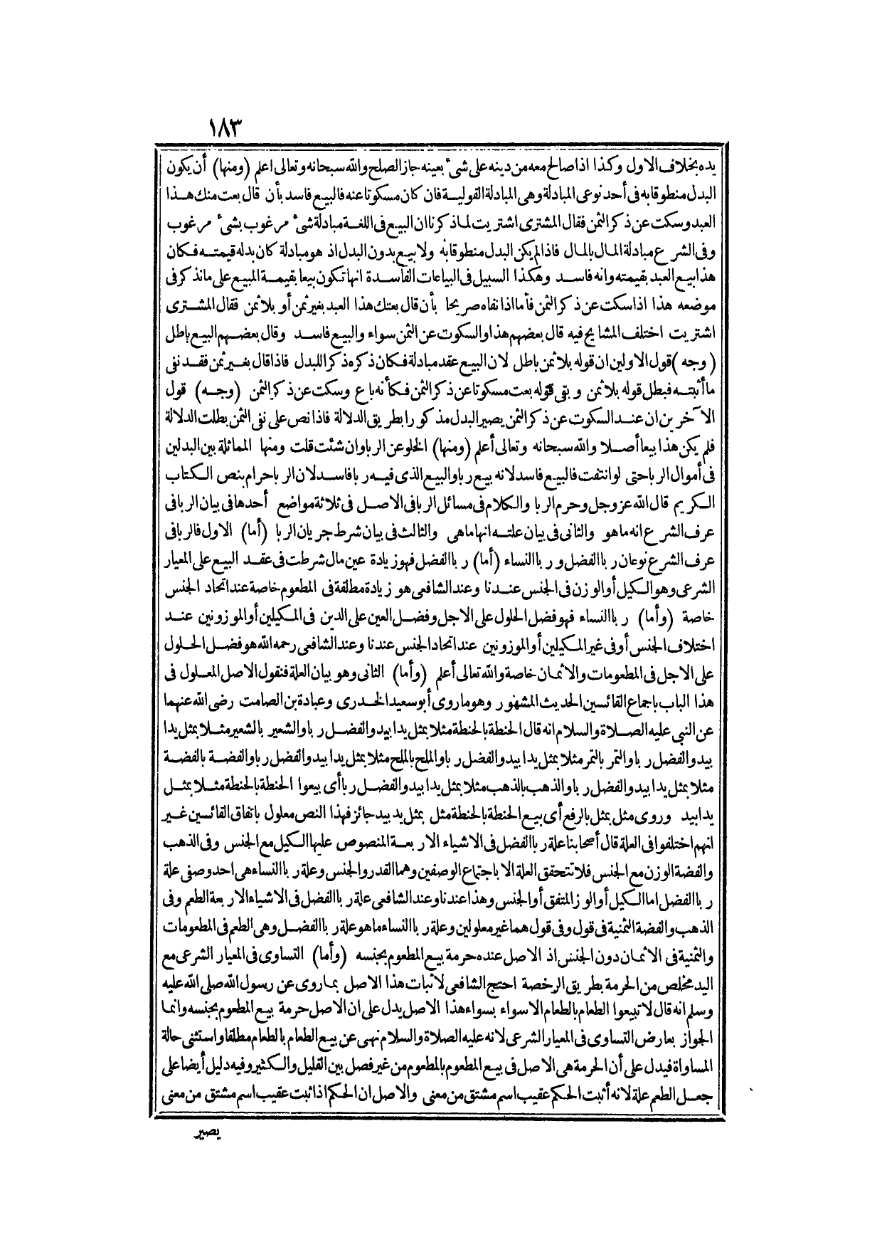 وَالْكَلَامُ فِي مَسَائِلِ الرِّبَا فِي الْأَصْلِ فِي ثَلَاثَةِ مَوَاضِعَ: أَحَدُهَا فِي بَيَانِ الرِّبَا فِي عُرْفِ الشَّرْعِ أَنَّهُ مَا هُوَ؟ ، وَالثَّانِي: فِي بَيَانِ عِلَّتِهِ أَنَّهَا مَا هِيَ؟ ، وَالثَّالِثُ: فِي بَيَانِ شَرْطِ جَرَيَانِ الرِّبَا (أَمَّا) الْأَوَّلُ فَالرِّبَا فِي عُرْفِ الشَّرْعِ نَوْعَانِ: رِبَا الْفَضْلِ، وَرِبَا النَّسَاءِ.