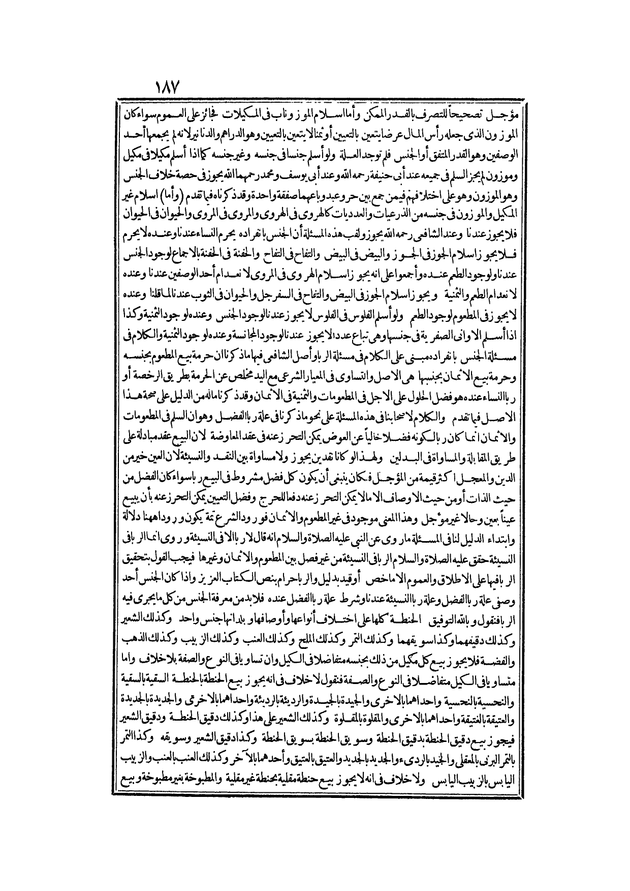 وَإِذَا كَانَ الْجِنْسُ أَحَدَ، وَصْفَيْ عِلَّةِ رِبَا الْفَضْلِ، وَعِلَّةِ رِبَا النَّسِيئَةِ عِنْدَنَا، وَشَرْطُ عِلَّةِ رِبَا الْفَضْلِ عِنْدَهُ فَلَا بُدَّ مِنْ مَعْرِفَةِ الْجِنْسِ مِنْ كُلِّ مَا يَجْرِي فِيهِ الرِّبَا فَنَقُولُ - وَبِاَللَّهِ التَّوْفِيقُ -: الْحِنْطَةُ كُلُّهَا عَلَى اخْتِلَافِ أَنْوَاعِهَا، وَأَوْصَافِهَا، وَبُلْدَانِهَا أَنَّهَا جِنْسٌ وَاحِدٌ، وَكَذَلِكَ الشَّعِيرُ، وَكَذَلِكَ دَقِيقُهُمَا، وَكَذَا سَوِيقُهُمَا، وَكَذَلِكَ التَّمْرُ، وَكَذَلِكَ الْمِلْحُ، وَكَذَلِكَ الْعِنَبُ، وَكَذَلِكَ الزَّبِيبُ، وَكَذَلِكَ الذَّهَبُ، وَالْفِضَّةُ فَلَا يَجُوزُ بَيْعُ كُلِّ مَكِيلٍ مِنْ ذَلِكَ بِجِنْسِهِ مُتَفَاضِلًا فِي الْكَيْلِ، وَإِنْ تَسَاوَيَا فِي النَّوْعِ، وَالصِّفَةِ بِلَا خِلَافٍ، وَأَمَّا مُتَسَاوِيًا فِي الْكَيْلِ مُتَفَاضِلًا فِي النَّوْعِ وَالصِّفَةِ فَنَقُولُ: لَا خِلَافَ فِي أَنَّهُ يَجُوزُ بَيْعُ الْحِنْطَةِ بِالْحِنْطَةِ السَّقِيَّةُ بِالسَّقِيَّةِ وَالنَّحْسِيَّةُ بِالنَّحْسِيَّةِ، وَإِحْدَاهُمَا بِالْأُخْرَى، وَالْجَيِّدَةُ بِالْجَيِّدَةِ، وَالرَّدِيئَةُ بِالرَّدِيئَةِ وَإِحْدَاهُمَا بِالْأُخْرَى، وَالْجَدِيدَةُ بِالْجَدِيدَةِ، وَالْعَتِيقَةُ بِالْعَتِيقَةِ وَإِحْدَاهُمَا بِالْأُخْرَى، وَالْمَقْلُوَّةُ بِالْمَقْلُوَّةِ.