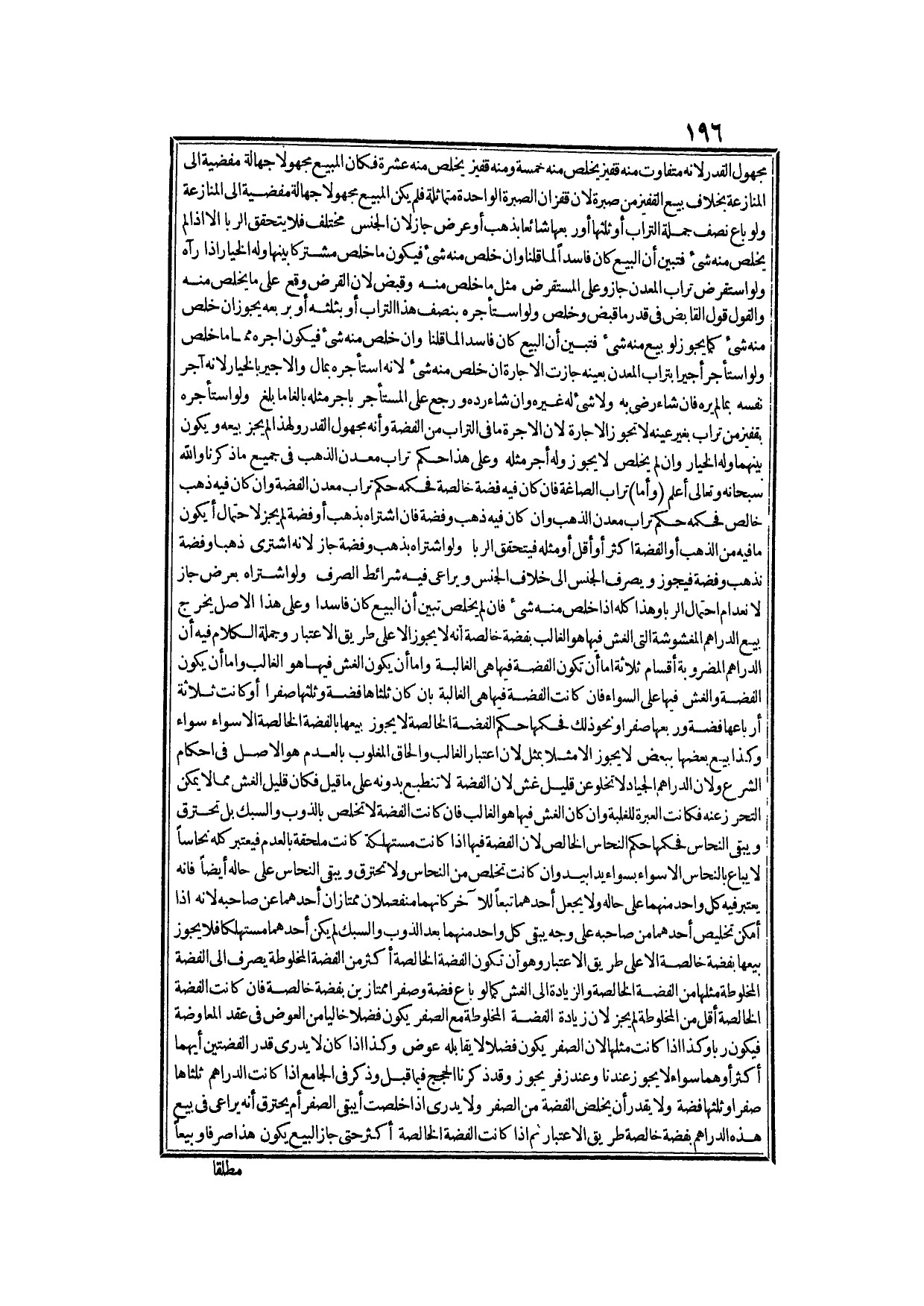وَإِنْ كَانَتْ تَخْلُصُ مِنْ النُّحَاسِ وَلَا تَحْتَرِقُ، وَيَبْقَى النُّحَاسُ عَلَى حَالِهِ أَيْضًا - فَإِنَّهُ يُعْتَبَرُ فِيهِ كُلُّ وَاحِدٍ مِنْهُمَا عَلَى حَالِهِ، وَلَا يُجْعَلُ أَحَدُهُمَا تَبَعًا لِلْآخَرِ، كَأَنَّهُمَا مُنْفَصِلَانِ، مُمْتَازَانِ أَحَدُهُمَا عَنْ صَاحِبِهِ؛ لِأَنَّهُ إذَا أَمْكَنَ تَخْلِيصُ أَحَدِهِمَا مِنْ صَاحِبِهِ عَلَى وَجْهٍ يَبْقَى كُلُّ وَاحِدٍ مِنْهُمَا بَعْدَ الذَّوْبِ وَالسَّبْكِ - لَمْ يَكُنْ أَحَدُهُمَا مُسْتَهْلَكًا - فَلَا يَجُوزُ بَيْعُهَا بِفِضَّةٍ خَالِصَةٍ إلَّا عَلَى طَرِيقِ الِاعْتِبَارِ، وَهُوَ أَنْ تَكُونَ الْفِضَّةُ الْخَالِصَةُ أَكْثَرَ مِنْ الْفِضَّةِ الْمَخْلُوطَةِ، يُصْرَفُ إلَى الْفِضَّةِ الْمَخْلُوطَةِ مِثْلُهَا مِنْ الْفِضَّةِ الْخَالِصَةِ، وَالزِّيَادَةُ إلَى الْغِشِّ، كَمَا لَوْ بَاعَ فِضَّةً وَصُفْرًا مُمْتَازَيْنِ بِفِضَّةٍ خَالِصَةٍ، فَإِنْ كَانَتْ الْفِضَّةُ الْخَالِصَةُ أَقَلَّ مِنْ الْمَخْلُوطَةِ لَمْ يَجُزْ؛ لِأَنَّ زِيَادَةَ الْفِضَّةِ الْمَخْلُوطَةِ مَعَ الصُّفْرِ يَكُونُ فَضْلًا خَالِيًا مِنْ الْعِوَضِ فِي عَقْدِ الْمُعَاوَضَةِ، فَيَكُونُ رِبًا، وَكَذَا إذَا كَانَتْ مِثْلَهَا، لِأَنَّ الصُّفْرَ يَكُونُ فَضْلًا لَا يُقَابِلُهُ عِوَضٌ، وَكَذَا إذَا كَانَ لَا يُدْرَى قَدْرُ الْفِضَّتَيْنِ أَيُّهُمَا أَكْثَرُ، أَوْ هُمَا سَوَاءٌ - لَا يَجُوزُ عِنْدَنَا.