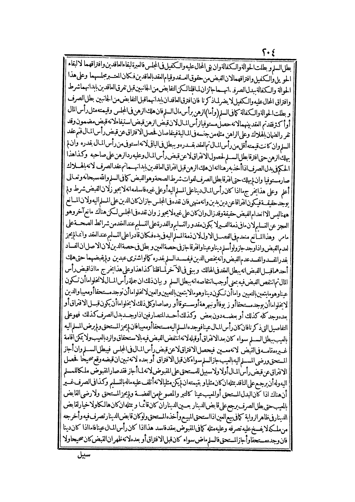 بَطَلَ السَّلَمُ وَبَطَلَتْ الْحَوَالَةُ وَالْكَفَالَةُ، وَإِنْ بَقِيَ الْمُحَالُ عَلَيْهِ وَالْكَفِيلُ فِي الْمَجْلِسِ، فَالْعِبْرَةُ لِبَقَاءِ الْعَاقِدَيْنِ وَافْتِرَاقِهِمَا لَا لِبَقَاءِ الْحَوِيلِ وَالْكَفِيلِ وَافْتِرَاقِهِمَا؛ لِأَنَّ الْقَبْضَ مِنْ حُقُوقِ الْعَقْدِ، وَقِيَامُ الْعَقْدِ بِالْعَاقِدَيْنِ، فَكَانَ الْمُعْتَبَرُ مَجْلِسَهُمَا، وَعَلَى هَذَا الْحَوَالَةُ وَالْكَفَالَةُ بِبَدَلِ الصَّرْفِ أَنَّهُمَا جَائِزَانِ لِمَا قُلْنَا، لَكِنَّ التَّقَابُضَ مِنْ الْجَانِبَيْنِ قَبْلَ تَفَرُّقِ الْعَاقِدَيْنِ بِأَبْدَانِهِمَا شَرْطٌ، وَافْتِرَاقُ الْمُحَالِ عَلَيْهِ وَالْكَفِيلِ لَا يَضُرُّ لِمَا ذَكَرْنَا، فَإِنْ افْتَرَقَ الْعَاقِدَانِ بِأَبْدَانِهِمَا قَبْلَ التَّقَابُضِ مِنْ الْجَانِبَيْنِ بَطَلَ الصَّرْفُ وَبَطَلَتْ الْحَوَالَةُ وَالْكَفَالَةُ كَمَا فِي السَّلَمِ.