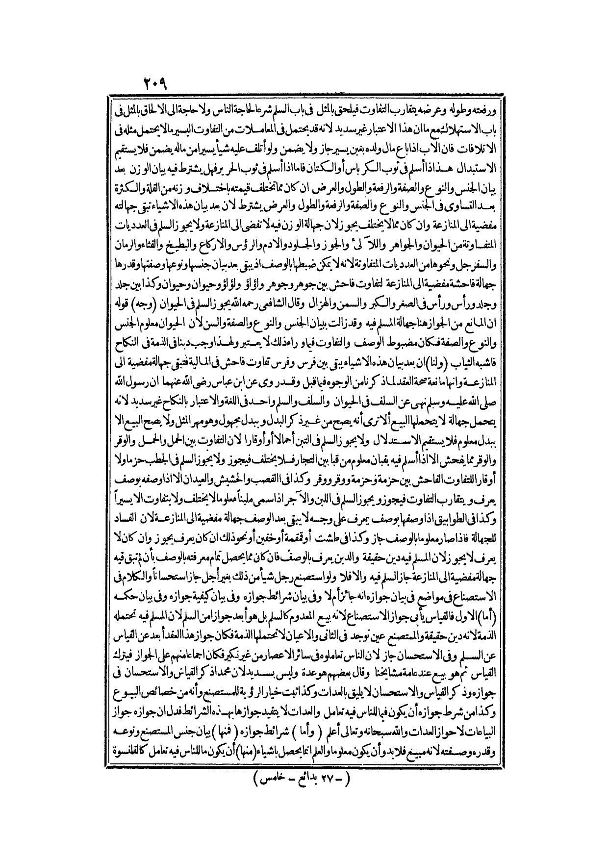 هَذَا إذَا أَسْلَمَ فِي ثَوْبِ الْكِرْبَاسِ أَوْ الْكَتَّانِ، فَأَمَّا إذَا أَسْلَمَ فِي ثَوْبِ الْحَرِيرِ فَهَلْ يُشْتَرَطُ فِيهِ بَيَانُ الْوَزْنِ بَعْدَ بَيَانِ الْجِنْسِ وَالنَّوْعِ وَالصِّفَةِ وَالرِّفْعَةِ وَالطُّولِ وَالْعَرْضِ؟ إنْ كَانَ مِمَّا تَخْتَلِفُ قِيمَتُهُ بِاخْتِلَافِ وَزْنِهِ مِنْ الْقِلَّةِ وَالْكَثْرَةِ بَعْدَ التَّسَاوِي فِي الْجِنْسِ وَالنَّوْعِ وَالصِّفَةِ وَالرِّفْعَةِ وَالطُّولِ وَالْعَرْضِ يُشْتَرَطُ؛ لِأَنَّ بَعْدَ بَيَانِ هَذِهِ الْأَشْيَاءِ تَبْقَى جَهَالَتُهُ مُفْضِيَةً إلَى الْمُنَازَعَةِ، وَإِنْ كَانَ مِمَّا لَا يَخْتَلِفُ يَجُوزُ؛ لِأَنَّ جَهَالَةَ الْوَزْنِ فِيهِ لَا تُفْضِي إلَى الْمُنَازَعَةِ وَلَا يَجُوزُ السَّلَمُ فِي الْعَدَدِيَّاتِ الْمُتَفَاوِتَةِ مِنْ الْحَيَوَانِ، وَالْجَوَاهِرِ، وَاللَّآلِئِ، وَالْجَوْزِ، وَالْجُلُودِ، وَالْأُدُمِ، وَالرُّءُوسِ، وَالْأَكَارِعِ، وَالْبِطِّيخِ، وَالْقِثَّاءِ، وَالرُّمَّانِ، وَالسَّفَرْجَلِ وَنَحْوِهَا مِنْ الْعَدَدِيَّاتِ الْمُتَفَاوِتَةِ؛ لِأَنَّهُ لَا يُمْكِنُ ضَبْطُهَا بِالْوَصْفِ إذْ يَبْقَى بَعْدَ بَيَانِ جِنْسِهَا وَنَوْعِهَا وَصِفَتِهَا وَقَدْرِهَا جَهَالَةٌ فَاحِشَةٌ مُفْضِيَةٌ إلَى الْمُنَازَعَةِ لِتَفَاوُتٍ فَاحِشٍ بَيْنَ جَوْهَرٍ وَجَوْهَرٍ، وَلُؤْلُؤٍ وَلُؤْلُؤٍ، وَحَيَوَانٍ وَحَيَوَانٍ، وَكَذَا بَيْنَ جِلْدٍ وَجِلْدٍ، وَرَأْسٍ وَرَأْسٍ فِي الصِّغَرِ، وَالْكِبْرِ، وَالسِّمَنِ، وَالْهُزَالِ، وَقَالَ الشَّافِعِيُّ - رَحِمَهُ اللَّهُ -: يَجُوزُ السَّلَمُ فِي الْحَيَوَانِ.