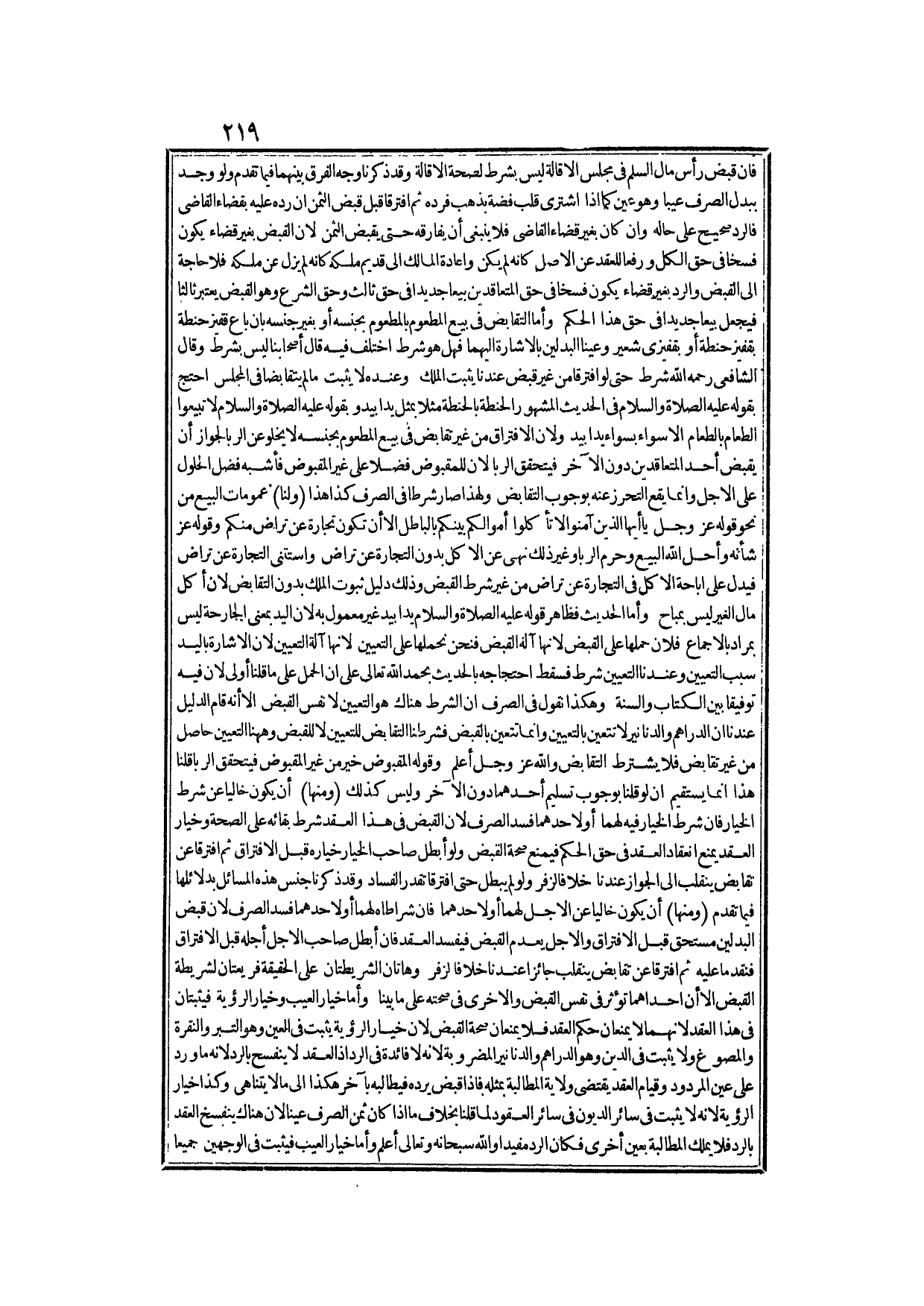 وَعِنْدَنَا التَّعْيِينُ شَرْطٌ فَسَقَطَ احْتِجَاجُهُ بِالْحَدِيثِ بِحَمْدِ اللَّهِ تَعَالَى عَلَى أَنَّ الْحَمْلَ عَلَى مَا قُلْنَا أَوْلَى؛ لِأَنَّ فِيهِ تَوْفِيقًا بَيْنَ الْكِتَابِ وَالسُّنَّةِ، وَهَكَذَا نَقُولُ فِي الصَّرْفِ: إنَّ الشَّرْطَ هُنَاكَ هُوَ التَّعْيِينُ لَا نَفْسُ الْقَبْضِ إلَّا أَنَّهُ قَامَ الدَّلِيلُ عِنْدَنَا أَنَّ الدَّرَاهِمَ وَالدَّنَانِيرَ لَا تَتَعَيَّنُ بِالتَّعْيِينِ وَإِنَّمَا تَتَعَيَّنُ بِالْقَبْضِ فَشَرَطْنَا التَّقَابُضَ لِلتَّعْيِينِ لَا لِلْقَبْضِ، وَهَهُنَا التَّعْيِينُ حَاصِلٌ مِنْ غَيْرِ تَقَابُضٍ فَلَا يُشْتَرَطُ التَّقَابُضُ وَاَللَّهُ عَزَّ وَجَلَّ أَعْلَمُ، وَقَوْلُهُ: الْمَقْبُوضُ خَيْرٌ مِنْ غَيْرِ الْمَقْبُوضِ، فَيَتَحَقَّقُ الرِّبَا قُلْنَا: هَذَا إنَّمَا يَسْتَقِيمُ أَنْ لَوْ قُلْنَا بِوُجُوبِ تَسْلِيمِ أَحَدِهِمَا دُونَ الْآخَرِ وَلَيْسَ كَذَلِكَ.