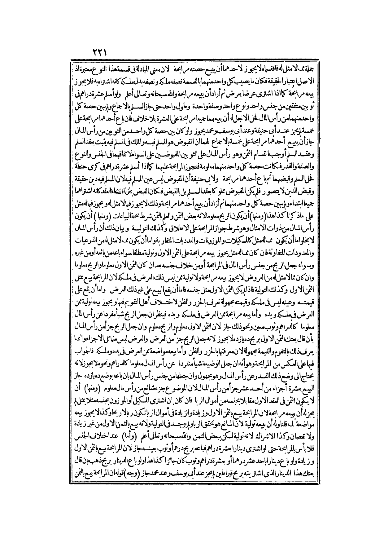 جُمْلَةً مِمَّا لَا مِثْلَ لَهُ فَاقْتَسَمَاهُ لَا يَجُوزُ لِأَحَدِهِمَا أَنْ يَبِيعَ حِصَّتَهُ مُرَابَحَةً؛ لِأَنَّ مَعْنَى الْمُبَادَلَةِ فِي قِسْمَةِ هَذَا النَّوْعِ مُعْتَبَرَةٌ إذْ الْأَصْلُ اعْتِبَارُ الْحَقِيقَةِ فَكَانَ مَا يُصِيبُ كُلَّ وَاحِدٍ مِنْهُمَا بِالْقِسْمَةِ نِصْفَهُ مِلْكُهُ وَنِصْفَهُ بَدَلُ مِلْكِهِ كَأَنَّهُ اشْتَرَاهُ بِهِ فَلَا يَجُوزُ بَيْعُهُ مُرَابَحَةً كَمَا إذَا اشْتَرَى عَرَضًا بِعَرَضٍ ثُمَّ أَرَادَ أَنْ يَبِيعَهُ مُرَابَحَةً، اللَّهُ سُبْحَانَهُ وَتَعَالَى أَعْلَمُ.