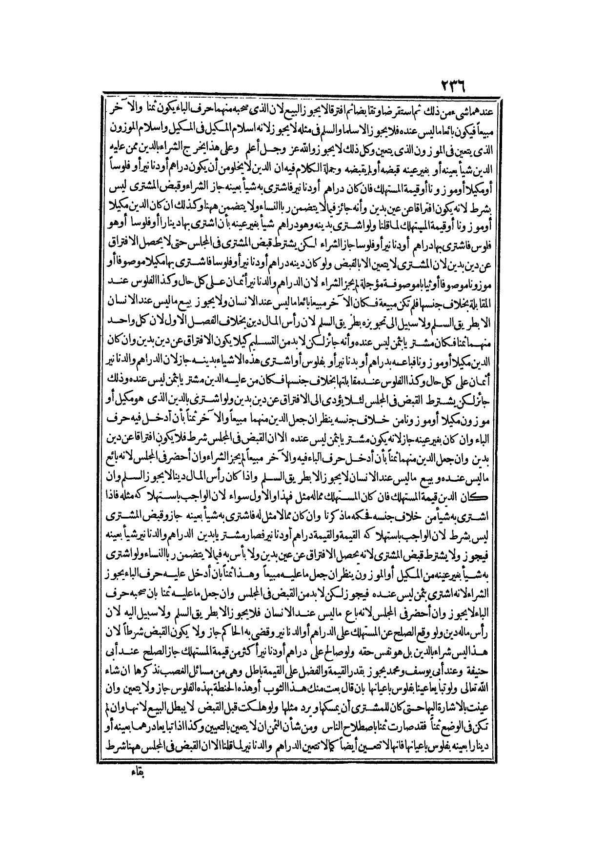 عِنْدَهُمَا شَيْءٌ مِنْ ذَلِكَ ثُمَّ اسْتَقْرَضَا، وَتَقَابَضَا ثُمَّ افْتَرَقَا لَا يَجُوزُ الْبَيْعُ؛ لِأَنَّ الَّذِي صَحِبَهُ مِنْهُمَا حَرْفُ الْبَاءِ يَكُونُ ثَمَنًا، وَالْآخَرُ مَبِيعًا فَيَكُونُ بَائِعًا مَا لَيْسَ عِنْدَهُ فَلَا يَجُوزُ إلَّا سَلَمًا، وَالسَّلَمُ فِي مِثْلِهِ لَا يَجُوزُ لِأَنَّهُ إسْلَامُ الْمَكِيلِ فِي الْمَكِيلِ، وَإِسْلَامُ الْمَوْزُونِ الَّذِي يَتَعَيَّنُ فِي الْمَوْزُونِ الَّذِي يَتَعَيَّنُ، وَكُلُّ ذَلِكَ لَا يَجُوزُ، وَاَللَّهُ - عَزَّ وَجَلَّ أَعْلَمُ.