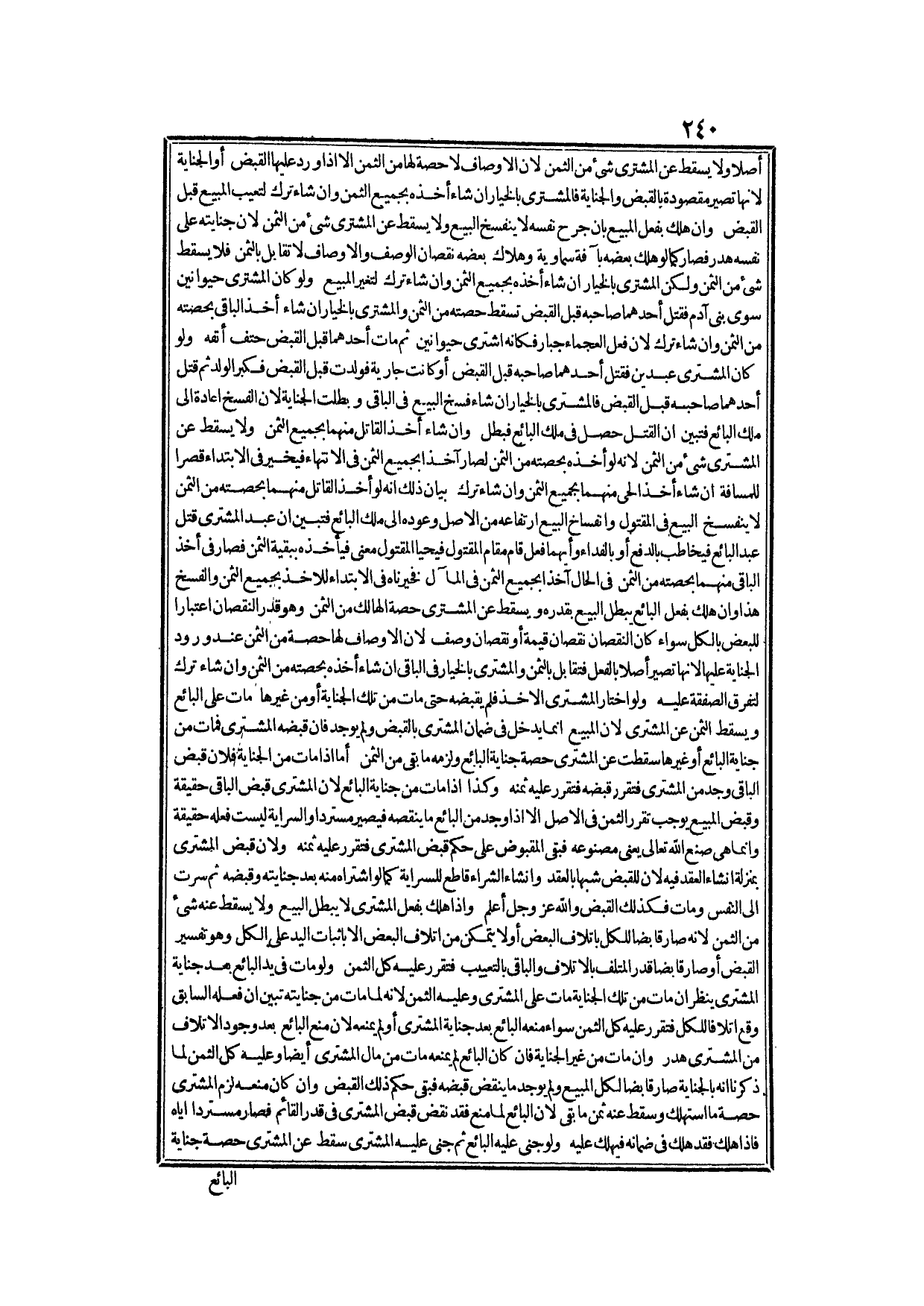 أَصْلًا، وَلَا يَسْقُطُ عَنْ الْمُشْتَرِي شَيْءٌ مِنْ الثَّمَنِ؛ لِأَنَّ الْأَوْصَافَ لَا حِصَّةَ لَهَا مِنْ الثَّمَنِ إلَّا إذَا وَرَدَ عَلَيْهَا الْقَبْضُ أَوْ الْجِنَايَةُ؛ لِأَنَّهَا تَصِيرُ مَقْصُودَةً بِالْقَبْضِ وَالْجِنَايَةِ فَالْمُشْتَرِي بِالْخِيَارِ إنْ شَاءَ أَخَذَهُ بِجَمِيعِ الثَّمَنِ، وَإِنْ شَاءَ تَرَكَ لِتَعَيُّبِ الْمَبِيعِ قَبْلَ الْقَبْضِ، وَإِنْ هَلَكَ بِفِعْلِ الْمَبِيعِ بِأَنْ جَرَحَ نَفْسَهُ لَا يَنْفَسِخُ الْبَيْعُ، وَلَا يَسْقُطُ عَنْ الْمُشْتَرِي شَيْءٌ مِنْ الثَّمَنِ؛ لِأَنَّ جِنَايَتَهُ عَلَى نَفْسِهِ هَدَرٌ، فَصَارَ كَمَا لَوْ هَلَكَ بَعْضُهُ بِآفَةٍ سَمَاوِيَّةٍ، وَهَلَاكُ بَعْضِهِ نُقْصَانُ الْوَصْفِ، وَالْأَوْصَافُ لَا تُقَابَلُ بِالثَّمَنِ فَلَا يَسْقُطُ شَيْءٌ مِنْ الثَّمَنِ، وَلَكِنَّ الْمُشْتَرِيَ بِالْخِيَارِ إنْ شَاءَ أَخَذَهُ بِجَمِيعِ الثَّمَنِ، وَإِنْ شَاءَ تَرَكَ لِتَغَيُّرِ الْمَبِيعِ.