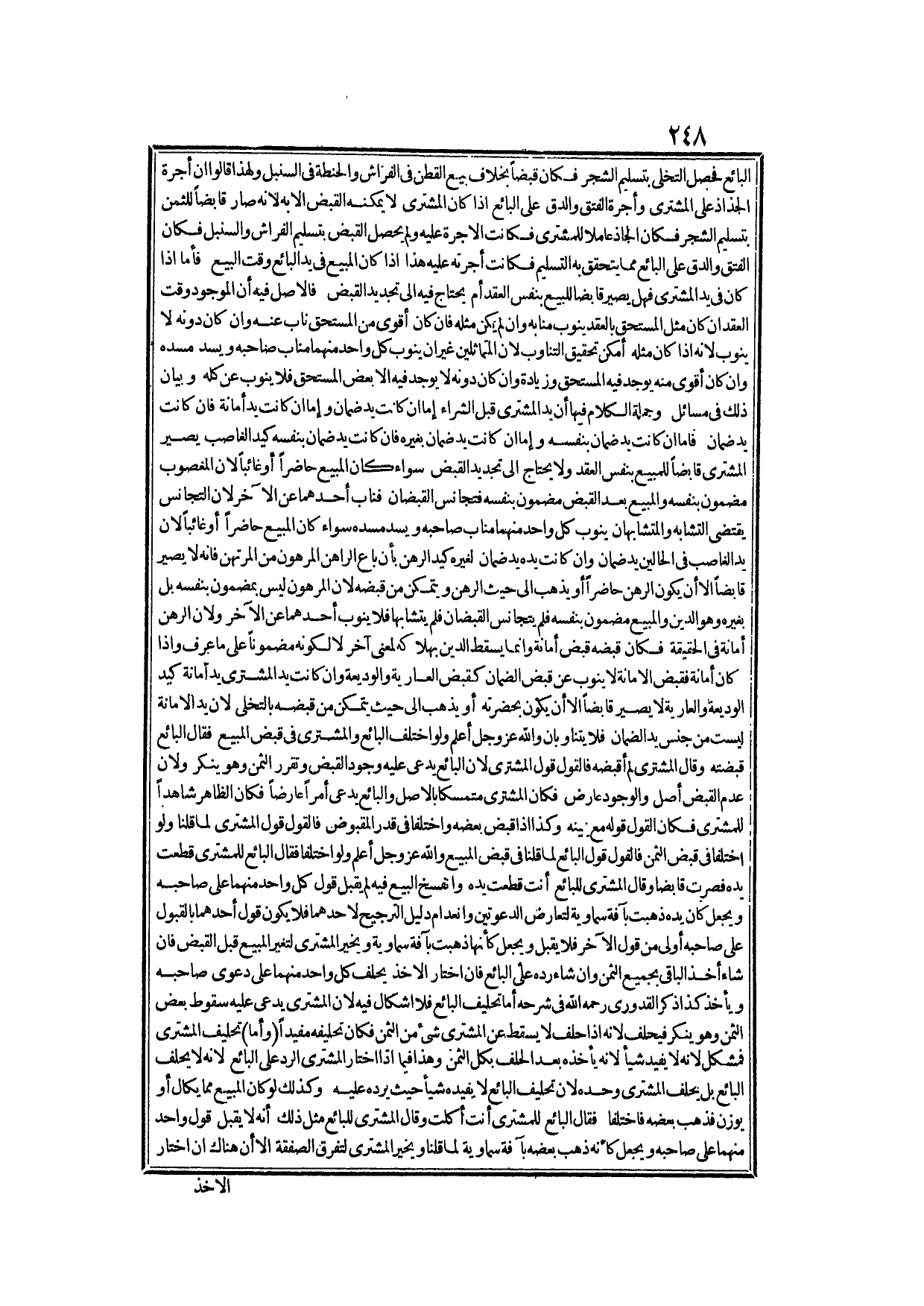 الْبَائِعِ فَحَصَلَ التَّخَلِّي بِتَسْلِيمِ الشَّجَرِ فَكَانَ قَبْضًا بِخِلَافِ بَيْعِ الْقُطْنِ فِي الْفِرَاشِ، وَالْحِنْطَةِ فِي السُّنْبُلِ، وَلِهَذَا قَالُوا: إنَّ أُجْرَةَ الْجِذَاذِ عَلَى الْمُشْتَرِي، وَأُجْرَةَ الْفَتْقِ، وَالدَّقِّ عَلَى الْبَائِعِ إذَا كَانَ الْمُشْتَرِي لَا يُمْكِنُهُ الْقَبْضُ إلَّا بِهِ؛ لِأَنَّهُ صَارَ قَابِضًا لِلثَّمَنِ بِتَسْلِيمِ الشَّجَرِ فَكَانَ الْجَاذُّ عَامِلًا لِلْمُشْتَرِي فَكَانَتْ الْأُجْرَةُ عَلَيْهِ، وَلَمْ يَحْصُلْ الْقَبْضُ بِتَسْلِيمِ الْفِرَاشِ، وَالسُّنْبُلِ فَكَانَ الْفَتْقُ، وَالدَّقُّ عَلَى الْبَائِعِ مِمَّا يَتَحَقَّقُ بِهِ التَّسْلِيمُ فَكَانَتْ أُجْرَتُهُ عَلَيْهِ هَذَا إذَا كَانَ الْمَبِيعُ فِي يَدِ الْبَائِعِ وَقْتَ الْبَيْعِ.