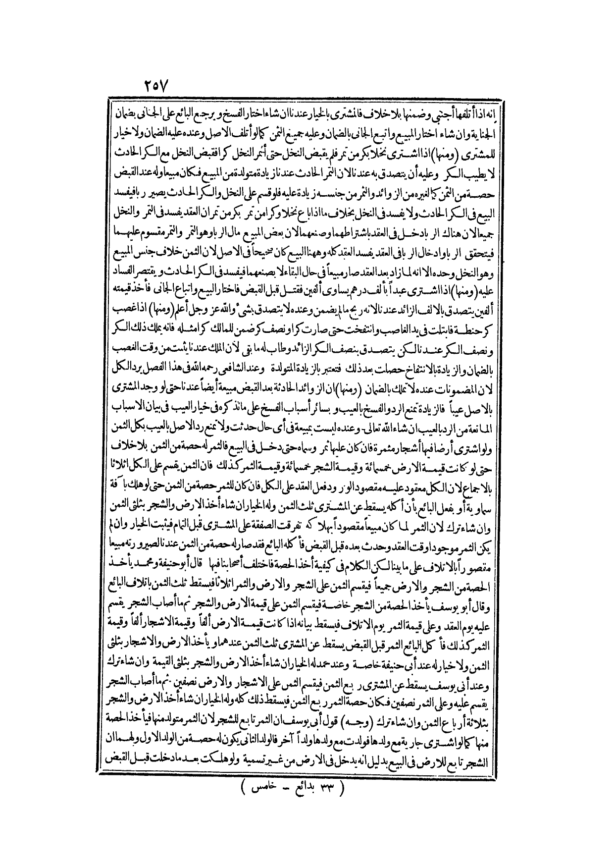 فَاخْتَلَفَ أَصْحَابُنَا فِيهَا قَالَ أَبُو حَنِيفَةَ وَمُحَمَّدٌ: يَأْخُذُ الْحِصَّةَ مِنْ الشَّجَرِ وَالْأَرْضِ جَمِيعًا فَيَقْسِمُ الثَّمَنَ عَلَى الشَّجَرِ، وَالْأَرْضِ، وَالثَّمَرِ أَثْلَاثًا فَيَسْقُطُ ثُلُثُ الثَّمَنِ بِإِتْلَافِ الْبَائِعِ، وَقَالَ أَبُو يُوسُفَ يَأْخُذُ الْحِصَّةَ مِنْ الشَّجَرِ خَاصَّةً فَيَقْسِمُ الثَّمَنَ عَلَى قِيمَةِ الْأَرْضِ، وَالشَّجَرِ ثُمَّ مَا أَصَابَ الشَّجَرَ يُقَسَّمُ عَلَيْهِ يَوْمَ الْعَقْدِ، وَعَلَى قِيمَةِ الثَّمَرِ يَوْمَ الْإِتْلَافِ فَيَسْقُطُ بَيَانُهُ إذَا كَانَتْ قِيمَةُ الْأَرْضِ أَلْفًا وَقِيمَةُ الْأَشْجَارِ أَلْفًا، وَقِيمَةُ الثَّمَرِ كَذَلِكَ فَأَكَلَ الْبَائِعُ الثَّمَرَ قَبْلَ الْقَبْضِ يَسْقُطُ عَنْ الْمُشْتَرِي ثُلُثُ الثَّمَنِ عِنْدَهُمَا وَيَأْخُذُ الْأَرْضَ، وَالْأَشْجَارَ بِثُلُثَيْ الثَّمَنِ وَلَا خِيَارَ لَهُ عِنْدَ أَبِي حَنِيفَةَ خَاصَّةً، وَعِنْدَ مُحَمَّدٍ لَهُ الْخِيَارُ إنْ شَاءَ أَخَذَ الْأَرْضَ، وَالشَّجَرَ بِثُلُثَيْ الْقِيمَةِ وَإِنْ شَاءَ تَرَكَ، وَعِنْدَ أَبِي يُوسُفَ يَسْقُطُ عَنْ الْمُشْتَرِي رُبْعُ الثَّمَنِ، فَيُقَسَّمُ الثَّمَنُ عَلَى الْأَشْجَارِ، وَالْأَرْضِ نِصْفَيْنِ ثُمَّ مَا أَصَابَ الشَّجَرَ يُقَسَّمُ عَلَيْهِ وَعَلَى الثَّمَرِ نِصْفَيْنِ، فَكَانَ حِصَّةُ الثَّمَرِ رُبْعَ الثَّمَنِ فَيَسْقُطُ ذَلِكَ كُلُّهُ وَلَهُ الْخِيَارُ إنْ شَاءَ أَخَذَ الْأَرْضَ، وَالشَّجَرَ بِثَلَاثَةِ أَرْبَاعِ الثَّمَنِ، وَإِنْ شَاءَ تَرَكَ.