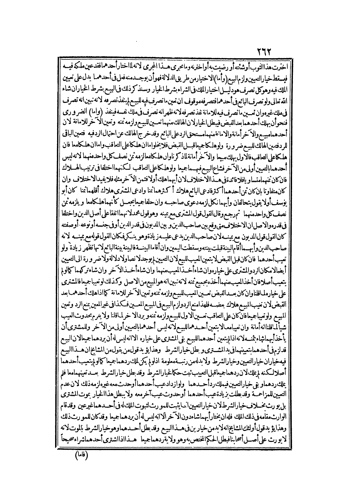 وَهَذَا يُؤَيِّدُ قَوْلَ مَنْ يَقُولُ مِنْ الْمَشَايِخِ: إنَّ هَذَا الْبَيْعَ فِيهِ خِيَارَانِ خِيَارُ التَّعْيِينِ وَخِيَارُ الشَّرْطِ وَلَا بُدَّ لَهُ مِنْ رُتْبَةٍ مَعْلُومَةٍ إذْ لَوْ لَمْ يَكُنْ لَمَلَكَ رَدَّهُمَا جَمِيعًا كَمَا لَوْ لَمْ يَتَعَيَّبْ أَحَدُهُمَا أَصْلًا لَكِنَّهُ لَمْ يَمْلِكْ؛ لِأَنَّ رَدَّهُمَا جَمِيعًا قَبْلَ التَّعْيِيبِ ثَبَتَ حُكْمًا لِخِيَارِ الشَّرْطِ وَقَدْ بَطَلَ خِيَارُ الشَّرْطِ بَعْدَ تَعَيُّنِهِمَا مَعًا فَلَمْ يَمْلِكْ رَدَّهُمَا وَبَقِيَ خِيَارُ التَّعْيِينِ فَيَمْلِكُ رَدَّ أَحَدِهِمَا، وَلَوْ ازْدَادَ عَيْبُ أَحَدِهِمَا أَوْ حَدَثَ مَعَهُ غَيْرُهُ لَزِمَهُ ذَلِكَ؛ لِأَنَّ عَدَمَ التَّعْيِينِ لِلْمُزَاحَمَةِ وَقَدْ بَطَلَتْ بِزِيَادَةِ عَيْبِ أَحَدِهِمَا أَوْ حُدُوثِ عَيْبٍ آخَرَ مَعَهُ، وَلَا يَبْطُلُ هَذَا الْخِيَارُ بِمَوْتِ الْمُشْتَرِي بَلْ يُورَثُ بِخِلَافِ خِيَارِ الشَّرْطِ؛ لِأَنَّ خِيَارَ التَّعْيِينِ إنَّمَا يَثْبُتُ لِلْمُوَرِّثِ لِثُبُوتِ الْمِلْكِ لَهُ فِي أَحَدِهِمَا غَيْرَ عَيْنٍ وَقَدْ قَامَ الْوَارِثُ مَقَامَهُ فِي ذَلِكَ الْمِلْكِ فَلَهُ أَنْ يَخْتَارَ أَيَّهُمَا شَاءَ دُونَ الْآخَرِ إلَّا أَنَّهُ لَيْسَ لَهُ أَنْ يَرُدَّهُمَا جَمِيعًا، وَقَدْ كَانَ لِلْمُوَرِّثِ ذَلِكَ، وَهَذَا يُؤَيِّدُ قَوْلَ أُولَئِكَ الْمَشَايِخِ أَنَّهُ لَا بُدَّ مِنْ خِيَارَيْنِ فِي هَذَا الْبَيْعِ، وَقَدْ بَطَلَ أَحَدُهُمَا " وَهُوَ خِيَارُ الشَّرْطِ " بِالْمَوْتِ؛ لِأَنَّهُ لَا يُورَثُ عَلَى أَصْلِ أَصْحَابِنَا فَبَطَلَ الْحُكْمُ الْمُخْتَصُّ بِهِ " وَهُوَ وِلَايَةُ رَدِّهِمَا جَمِيعًا " هَذَا إذَا اشْتَرَى أَحَدَهُمَا شِرَاءً صَحِيحًا.