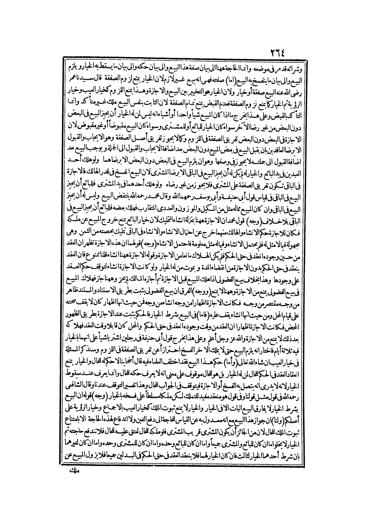 وَعَلَى هَذَا يَخْرُجُ مَا إذَا كَانَ الْمَبِيعُ شَيْئًا وَاحِدًا أَوْ أَشْيَاءَ أَنَّهُ لَيْسَ لِمَنْ لَهُ الْخِيَارُ أَنْ يُجِيزَ الْبَيْعَ فِي الْبَعْضِ دُونَ الْبَعْضِ مِنْ غَيْرِ رِضَا الْآخَرِ سَوَاءً كَانَ الْخِيَارُ لِلْبَائِعِ أَوْ لِلْمُشْتَرِي وَسَوَاءً كَانَ الْبَيْعُ مَقْبُوضًا أَوْ غَيْرَ مَقْبُوضٍ؛ لِأَنَّ الْإِجَازَةَ فِي الْبَعْضِ دُونَ الْبَعْضِ تَفْرِيقُ الصَّفْقَةِ فِي اللُّزُومِ، وَكَمَا لَا يَجُوزُ تَفْرِيقُ أَصْلِ الصَّفْقَةِ " وَهُوَ الْإِيجَابُ وَالْقَبُولُ " إلَّا بِرِضَا الْعَاقِدَيْنِ بِأَنْ يَقْبَلَ الْبَيْعَ فِي بَعْضِ الْمَبِيعِ دُونَ الْبَعْضِ بَعْدَ إضَافَةِ الْإِيجَابِ وَالْقَبُولِ إلَى الْجُمْلَةِ وَيُوجَبُ الْبَيْعُ بَعْدَ إضَافَةِ الْقَبُولِ إلَى جُمْلَتِهِ لَا يَجُوزُ فِي وَصْفِهَا وَهُوَ أَنْ يَلْزَمَ الْبَيْعُ فِي الْبَعْضِ دُونَ الْبَعْضِ إلَّا بِرِضَاهُمَا.