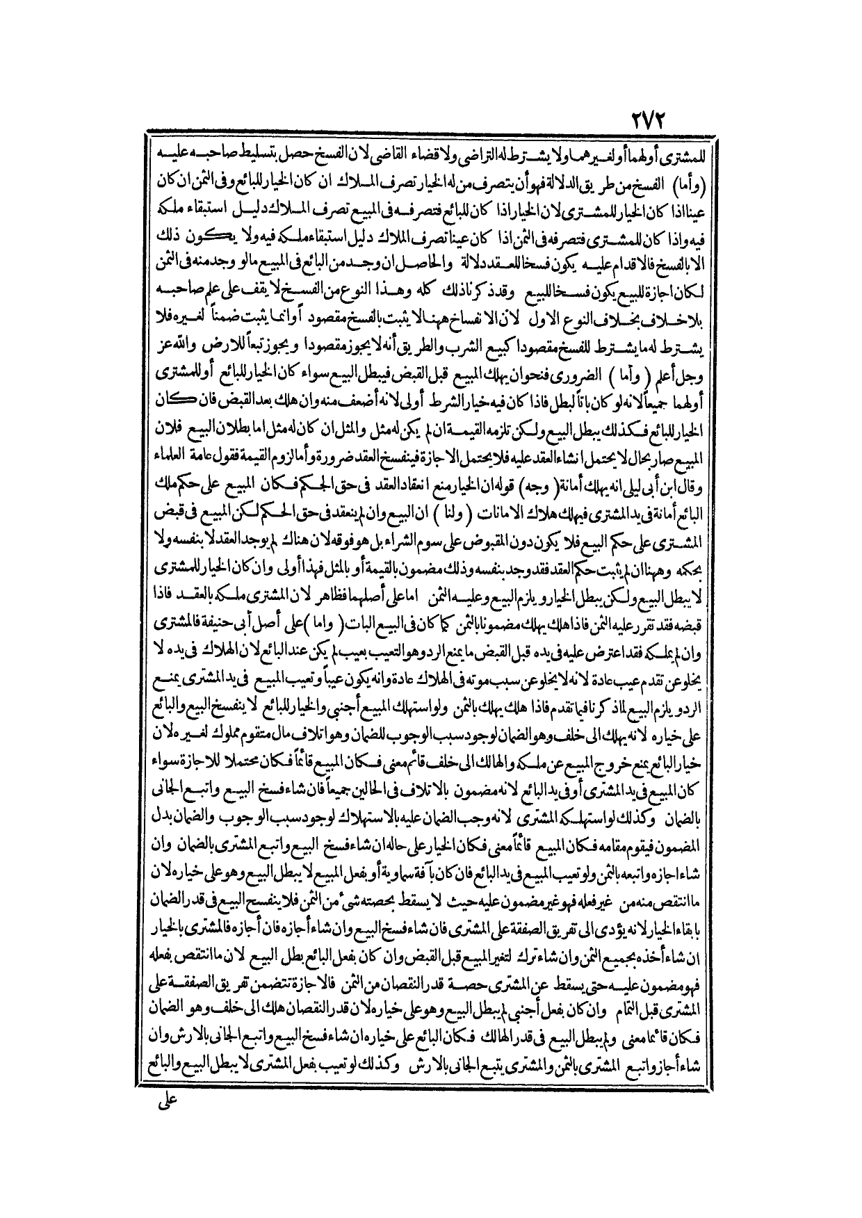 (وَأَمَّا) الضَّرُورِيُّ، فَنَحْوَ أَنْ يَهْلِكَ الْمَبِيعُ قَبْلَ الْقَبْضِ، فَيَبْطُلُ الْبَيْعُ سَوَاءٌ كَانَ الْخِيَارُ لِلْبَائِعِ أَوْ لِلْمُشْتَرِي أَوْ لَهُمَا جَمِيعًا؛ لِأَنَّهُ لَوْ كَانَ بَاتًّا لَبَطَلَ، فَإِذَا كَانَ فِيهِ خِيَارُ الشَّرْطِ أَوْلَى؛ لِأَنَّهُ أَضْعَفُ مِنْهُ، وَإِنْ هَلَكَ بَعْدَ الْقَبْضِ، فَإِنْ كَانَ الْخِيَارُ لِلْبَائِعِ، فَكَذَلِكَ يَبْطُلُ الْبَيْعُ، وَلَكِنْ تَلْزَمُهُ الْقِيمَةُ إنْ لَمْ يَكُنْ لَهُ مِثْلٌ، وَالْمِثْلُ إنْ كَانَ لَهُ مِثْلٌ إمَّا بُطْلَانُ الْبَيْعِ، فَلِأَنَّ الْمَبِيعَ صَارَ بِحَالٍ لَا يَحْتَمِلُ إنْشَاءَ الْعَقْدِ عَلَيْهِ، فَلَا يَحْتَمِلُ الْإِجَازَةَ، فَيَنْفَسِخُ الْعَقْدُ ضَرُورَةً.