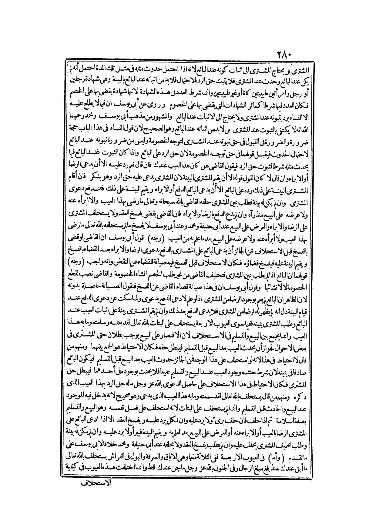وَإِنْ لَمْ يُقِمْ الْمُشْتَرِي بَيِّنَةً عَلَى إثْبَاتِ الْعَيْبِ عِنْدَ الْبَائِعِ وَطَلَبَ الْمُشْتَرِي يَمِينَهُ فَفِيمَا سِوَى الْعُيُوبِ الْأَرْبَعَةِ يُسْتَحْلَفُ عَلَى الْبَتَاتِ بِاَللَّهِ تَعَالَى لَقَدْ بِعْتُهُ وَسَلَّمْتُهُ وَمَا بِهِ هَذَا الْعَيْبُ، وَإِنَّمَا يُجْمَعُ بَيْنَ الْبَيْعِ وَالتَّسْلِيمِ فِي الِاسْتِحْلَافِ؛ لِأَنَّ الِاقْتِصَارَ عَلَى الْبَيْعِ يُوجِبُ بُطْلَانَ حَقِّ الْمُشْتَرِي فِي بَعْضِ الْأَحْوَالِ لِجَوَازِ أَنْ يَحْدُثَ الْعَيْبُ بَعْدَ الْبَيْعِ قَبْلَ التَّسْلِيمِ فَيَبْطُلُ حَقُّهُ فَكَانَ الِاحْتِيَاطُ هُوَ الْجَمْعُ بَيْنَهُمَا، وَمِنْهُمْ مَنْ قَالَ: لَا احْتِيَاطَ فِي هَذَا لِأَنَّهُ لَوْ اُسْتُحْلِفَ عَلَى هَذَا الْوَجْهِ فَمِنْ الْجَائِزِ حُدُوثُ الْعَيْبِ بَعْدَ الْبَيْعِ قَبْلَ التَّسْلِيمِ فَيَكُونُ الْبَائِعُ صَادِقًا فِي يَمِينِهِ؛ لِأَنَّ شَرْطَ حِنْثِهِ وُجُودُ الْعَيْبِ عِنْدَ الْبَيْعِ وَالتَّسْلِيمِ جَمِيعًا فَلَا يَحْنَثُ بِوُجُودِهِ فِي أَحَدِهِمَا فَيَبْطُلُ حَقُّ الْمُشْتَرِي فَكَانَ الِاحْتِيَاطُ فِي هَذَا الِاسْتِحْلَافِ عَلَى حَاصِلِ الدَّعْوَى بِاَللَّهِ عَزَّ وَجَلَّ مَا لَهُ حَقُّ الرَّدِّ بِهَذَا الْعَيْبِ الَّذِي ذَكَرَهُ، وَمِنْهُمْ مَنْ قَالَ: يُسْتَحْلَفُ بِاَللَّهِ تَعَالَى لَقَدْ سَلَّمْتُهُ وَمَا بِهِ هَذَا الْعَيْبُ الَّذِي يَدَّعِي وَهُوَ صَحِيحٌ؛ لِأَنَّهُ يَدْخُلُ فِيهِ الْمَوْجُودُ عِنْدَ الْبَيْعِ وَالْحَادِثُ قَبْلَ التَّسْلِيمِ.