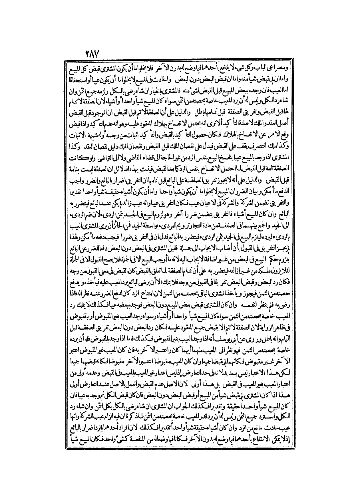 وَلَوْ كَانَتْ الصَّفْقَةُ تَامَّةً قَبْلَ الْقَبْضِ لَمَا احْتَمَلَ الِانْفِسَاخَ بِنَفْسِ الرَّدِّ كَمَا بَعْدَ الْقَبْضِ فَيَثْبُتُ بِهَذِهِ الدَّلَائِلِ أَنَّ الصَّفْقَةَ لَيْسَتْ بِتَامَّةٍ قَبْلَ الْقَبْضِ، وَالدَّلِيلُ عَلَى أَنَّهُ لَا يَجُوزُ تَفْرِيقُ الصَّفْقَةِ عَلَى الْبَائِعِ قَبْلَ تَمَامِهَا أَنَّ التَّفْرِيقَ إضْرَارٌ بِالْبَائِعِ، وَالضَّرَرُ وَاجِبُ الدَّفْعِ مَا أَمْكَنَ، وَبَيَانُ الضَّرَرِ أَنَّ الْمَبِيعَ لَا يَخْلُو إمَّا أَنْ يَكُونَ شَيْئًا وَاحِدًا وَإِمَّا أَنْ يَكُونَ أَشْيَاءَ حَقِيقَةً شَيْئًا وَاحِدًا تَقْدِيرًا، وَالتَّفْرِيقُ تَضَمَّنَ الشَّرِكَةَ وَالشَّرِكَةُ فِي الْأَعْيَانِ عَيْبٌ فَكَانَ التَّفْرِيقُ عَيْبًا وَأَنَّهُ عَيْبٌ زَائِدٌ لَمْ يَكُنْ عِنْدَ الْبَائِعِ فَيَتَضَرَّرُ بِهِ الْبَائِعُ.
