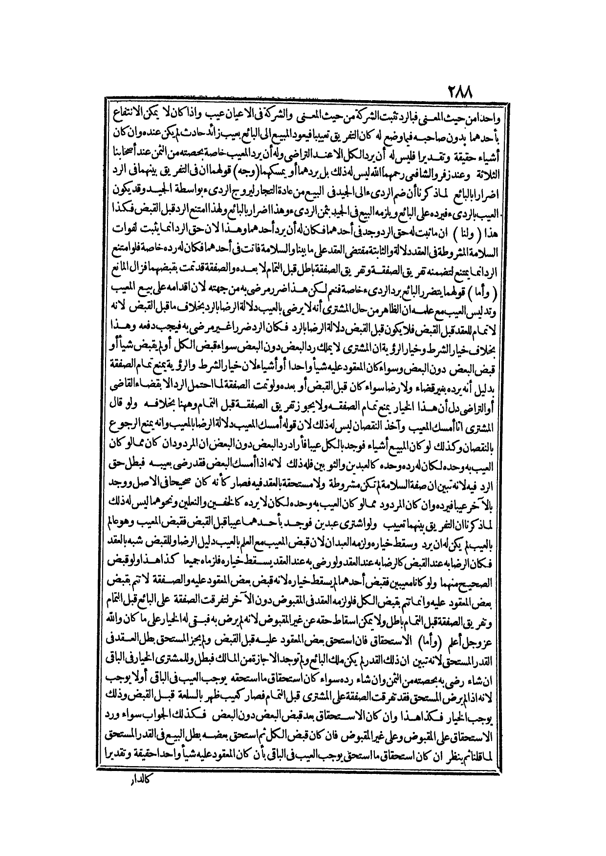 (وَأَمَّا) قَوْلُهُمَا: يَتَضَرَّرُ الْبَائِعُ بِرَدِّ الرَّدِيءِ خَاصَّةً، فَنَعَمْ لَكِنَّ هَذَا ضَرَرٌ مَرْضِيٌّ بِهِ مِنْ جِهَتِهِ؛ لِأَنَّ إقْدَامَهُ عَلَى بَيْعِ الْمَعِيبِ وَتَدْلِيسِ الْعَيْبِ مَعَ عِلْمِهِ أَنَّ الظَّاهِرَ مِنْ حَالِ الْمُشْتَرِي أَنَّهُ لَا يَرْضَى بِالْعَيْبِ - دَلَالَةُ الرِّضَا بِالرَّدِّ، بِخِلَافِ مَا قَبْلَ الْقَبْضِ؛ لِأَنَّهُ لَا تَمَامَ لِلْعَقْدِ قَبْلَ الْقَبْضِ فَلَا يَكُونُ قَبْلَ الْقَبْضِ دَلَالَةَ الرِّضَا بِالرَّدِّ فَكَانَ الرَّدُّ ضَرَرًا غَيْرَ مَرْضِيٍّ بِهِ فَيَجِبُ دَفْعُهُ وَهَذَا بِخِلَافِ خِيَارِ الشَّرْطِ وَخِيَارِ الرُّؤْيَةِ أَنَّ الْمُشْتَرِيَ لَا يَمْلِكُ رَدَّ الْبَعْضِ دُونَ الْبَعْضِ سَوَاءٌ قَبَضَ الْكُلَّ أَوْ لَمْ يَقْبِضْ شَيْئًا أَوْ قَبَضَ الْبَعْضَ دُونَ الْبَعْضِ، وَسَوَاءٌ كَانَ الْمَعْقُودُ عَلَيْهِ شَيْئًا وَاحِدًا أَوْ أَشْيَاءَ؛ لِأَنَّ خِيَارَ الشَّرْطِ وَالرُّؤْيَةِ يَمْنَعُ تَمَامَ الصَّفْقَةِ بِدَلِيلِ أَنَّهُ يَرُدُّهُ بِغَيْرِ قَضَاءٍ وَلَا رِضًا، سَوَاءٌ كَانَ قَبْلَ الْقَبْضِ أَوْ بَعْدَهُ.