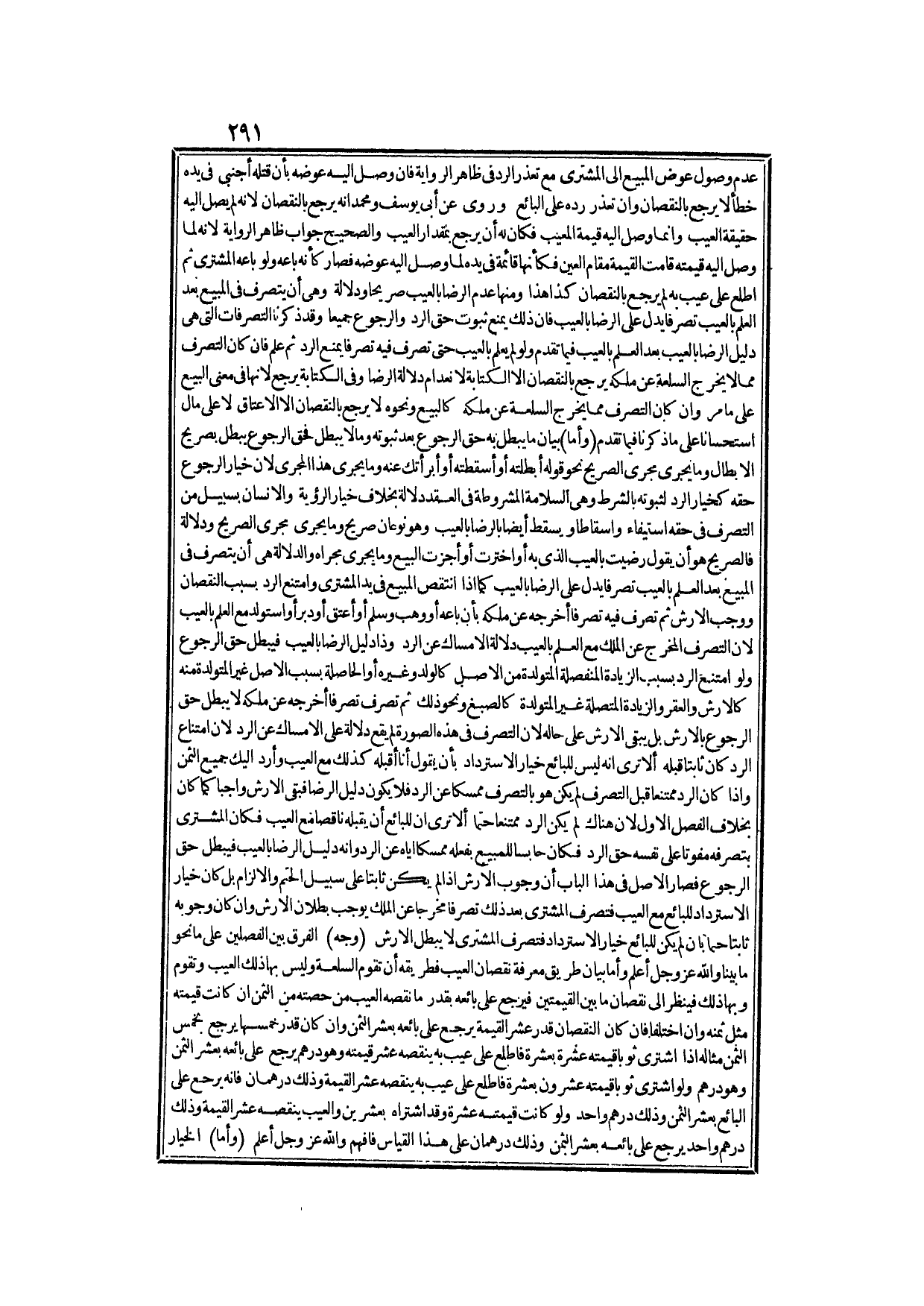 وَمِنْهَا عَدَمُ الرِّضَا بِالْعَيْبِ صَرِيحًا وَدَلَالَةً وَهِيَ أَنْ يَتَصَرَّفَ فِي الْمَبِيعِ بَعْدَ الْعِلْمِ بِالْعَيْبِ تَصَرُّفًا يَدُلُّ عَلَى الرِّضَا بِالْعَيْبِ فَإِنَّ ذَلِكَ يَمْنَعُ ثُبُوتَ حَقِّ الرَّدِّ وَالرُّجُوعِ جَمِيعًا، وَقَدْ ذَكَرْنَا التَّصَرُّفَاتِ الَّتِي هِيَ دَلِيلُ الرِّضَا بِالْعَيْبِ بَعْدَ الْعِلْمِ بِالْعَيْبِ فِيمَا تَقَدَّمَ وَلَوْ لَمْ يَعْلَمْ بِالْعَيْبِ حَتَّى تَصَرَّفَ فِيهِ تَصَرُّفًا يَمْنَعُ الرَّدَّ ثُمَّ عَلِمَ فَإِنْ كَانَ التَّصَرُّفُ مَا لَا يُخْرِجُ السِّلْعَةَ عَنْ مِلْكِهِ يَرْجِعُ بِالنُّقْصَانِ إلَّا الْكِتَابَةَ لِانْعِدَامِ دَلَالَةِ الرِّضَا، وَفِي الْكِتَابَةِ يَرْجِعُ؛ لِأَنَّهَا فِي مَعْنَى الْبَيْعِ عَلَى مَا مَرَّ وَإِنْ كَانَ التَّصَرُّفُ مِمَّا يُخْرِجُ السِّلْعَةَ عَنْ مِلْكِهِ كَالْبَيْعِ وَنَحْوِهِ لَا يَرْجِعُ بِالنُّقْصَانِ إلَّا الْإِعْتَاقُ لَا عَلَى مَالٍ اسْتِحْسَانًا عَلَى مَا ذَكَرْنَا فِيمَا تَقَدَّمَ.