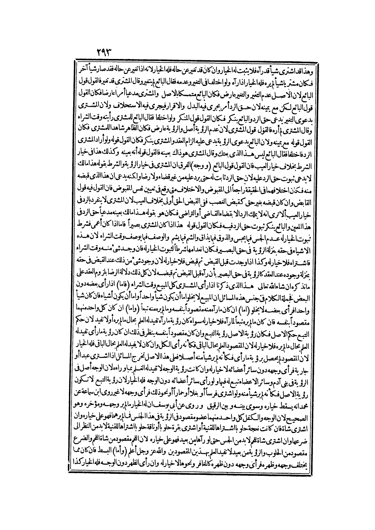 هَذَا إذَا كَانَ الْمُشْتَرِي بَصِيرًا، فَأَمَّا إذَا كَانَ أَعْمَى فَشَرْطُ ثُبُوتِ الْخِيَارِ لَهُ عَدَمُ الْحَبْسِ فِيمَا يُحْبَسُ وَالذَّوْقُ فِيمَا يُذَاقُ وَالشَّمُّ فِيمَا يُشَمُّ وَالْوَصْفُ فِيمَا يُوصَفُ وَقْتَ الشِّرَاءِ؛ لِأَنَّ هَذِهِ الْأَشْيَاءَ فِي حَقِّهِ بِمَنْزِلَةِ الرُّؤْيَةِ فِي حَقِّ الْبَصِيرِ، فَكَانَ انْعِدَامُهَا شَرْطًا لِثُبُوتِ الْخِيَارِ لَهُ، فَإِنْ وُجِدَ شَيْءٌ مِنْهُ وَقْتَ الشِّرَاءِ فَاشْتَرَاهُ فَلَا خِيَارَ لَهُ، وَكَذَا إذَا وُجِدَتْ قَبْلَ الْقَبْضِ ثُمَّ قَبَضَ فَلَا خِيَارَ لَهُ؛ لِأَنَّ وُجُودَ شَيْءٍ مِنْ ذَلِكَ عِنْدَ الْقَبْضِ فِي حَقِّهِ بِمَنْزِلَةِ وُجُودِهِ عِنْدَ الْعَقْدِ كَالرُّؤْيَةِ فِي حَقِّ الْبَصِيرِ بِأَنْ رَآهُ قَبْلَ الْقَبْضِ ثُمَّ قَبَضَهُ؛ لِأَنَّ كُلَّ ذَلِكَ دَلَالَةُ الرِّضَا بِلُزُومِ الْعَقْدِ عَلَى مَا نَذْكُرهُ إنْ شَاءَ اللَّهُ تَعَالَى هَذَا الَّذِي ذَكَرْنَا إذَا رَأَى الْمُشْتَرِي كُلَّ الْمَبِيعِ وَقْتَ الشِّرَاءِ.