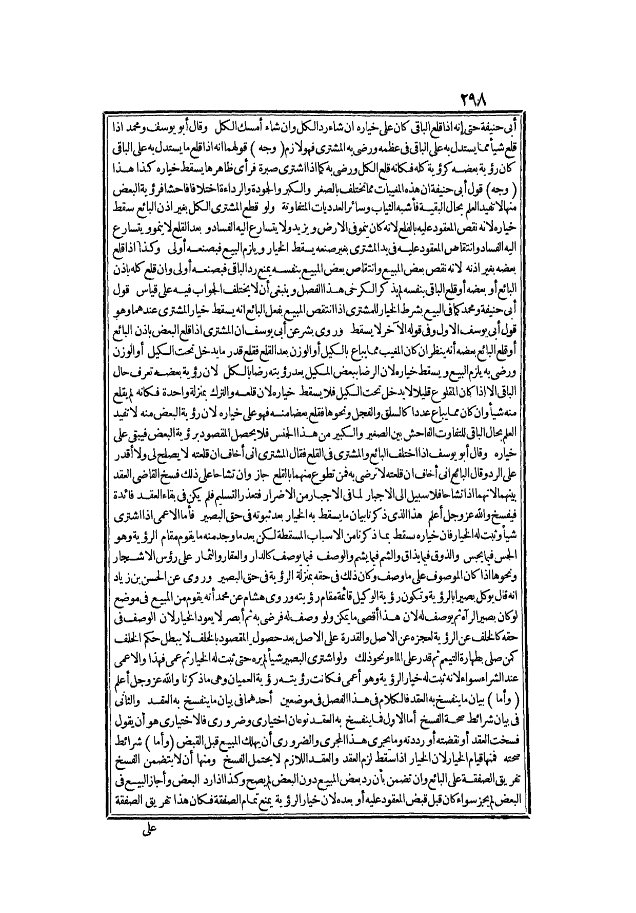 وَيَنْبَغِي أَنْ لَا يَخْتَلِفَ الْجَوَابُ فِيهِ عَلَى قِيَاسِ قَوْلِ أَبِي حَنِيفَةَ، وَمُحَمَّدٍ كَمَا فِي الْبَيْعِ بِشَرْطِ الْخِيَارِ لِلْمُشْتَرِي إذَا انْتَقَصَ الْمَبِيعُ بِفِعْلِ الْبَائِعِ، أَنَّهُ يَسْقُطُ خِيَارُ الْمُشْتَرِي عِنْدَهُمَا، وَهُوَ قَوْلُ أَبِي يُوسُفَ الْأَوَّلُ، وَفِي قَوْلِهِ الْآخَرِ لَا يَسْقُطُ، وَرَوَى بِشْرٌ عَنْ أَبِي يُوسُفَ أَنَّ الْمُشْتَرِيَ إذَا قَلَعَ الْبَعْضَ بِإِذْنِ الْبَائِعِ أَوْ قَلَعَ الْبَائِعُ بَعْضَهُ أَنَّهُ يَنْظُرُ إنْ كَانَ الْمُغَيَّبُ مِمَّا يُبَاعُ بِالْكَيْلِ أَوْ الْوَزْنِ بَعْدَ الْقَلْعِ فَقَلَعَ قَدْرَ مَا يَدْخُلُ تَحْتَ الْكَيْلِ أَوْ الْوَزْنِ، وَرَضِيَ بِهِ يَلْزَمُ الْبَيْعُ، وَيَسْقُطُ خِيَارُهُ؛ لِأَنَّ الرِّضَا بِبَعْضِ الْمَكِيلِ بَعْدَ رُؤْيَتِهِ رِضًا بِالْكُلِّ؛ لِأَنَّ رُؤْيَةَ بَعْضِهِ تُعَرِّفُ حَالَ الْبَاقِي إلَّا إذَا كَانَ الْمَقْلُوعُ قَلِيلًا لَا يَدْخُلُ تَحْتَ الْكَيْلِ فَلَا يَسْقُطُ خِيَارُهُ؛ لِأَنَّ قَلْعَهُ وَالتَّرْكَ بِمَنْزِلَةٍ وَاحِدَةٍ، فَكَأَنَّهُ لَمْ يَقْلَعْ مِنْهُ شَيْئًا، وَإِنْ كَانَ مِمَّا يُبَاعُ عَدَدًا كَالسَّلْقِ، وَالْفُجْلِ، وَنَحْوِهَا فَقَلَعَ بَعْضًا مِنْهُ فَهُوَ عَلَى خِيَارِهِ؛ لِأَنَّ رُؤْيَةَ الْبَعْضِ مِنْهُ لَا تُفِيدُ الْعِلْمَ بِحَالِ الْبَاقِي لِلتَّفَاوُتِ الْفَاحِشِ بَيْنَ الصَّغِيرِ وَالْكَبِيرِ مِنْ هَذَا الْجِنْسِ فَلَا يَحْصُلُ الْمَقْصُودُ بِرُؤْيَةِ الْبَعْضِ، فَيَبْقَى عَلَى خِيَارِهِ.