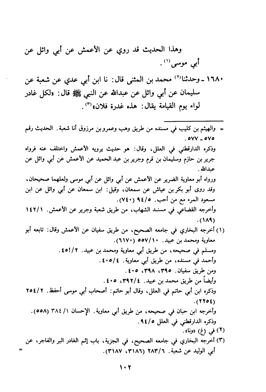 1680 - وَحَدَّثَنَا مُحَمَّدُ بْنُ الْمُثَنَّى، قَالَ: نا ابْنُ أَبِي عَدِيٍّ، عَنْ شُعْبَةَ، عَنْ سُلَيْمَانَ، عَنْ أَبِي وَائِلٍ، عَنْ عَبْدِ اللَّهِ، عَنِ النَّبِيِّ صَلَّى اللهُ عَلَيْهِ وَسَلَّمَ قَالَ: «§لِكُلِّ غَادِرٍ لِوَاءٌ يَوْمَ الْقِيَامَةِ يُقَالُ هَذِهِ غَدْرَةُ فُلَانٍ» -[103]-، وَهَذَا الْحَدِيثُ لَا نَعْلَمُ رَوَاهُ عَنْ سُلَيْمَانَ، عَنْ أَبِي وَائِلٍ، عَنْ عَبْدِ اللَّهِ إِلَّا شُعْبَةُ