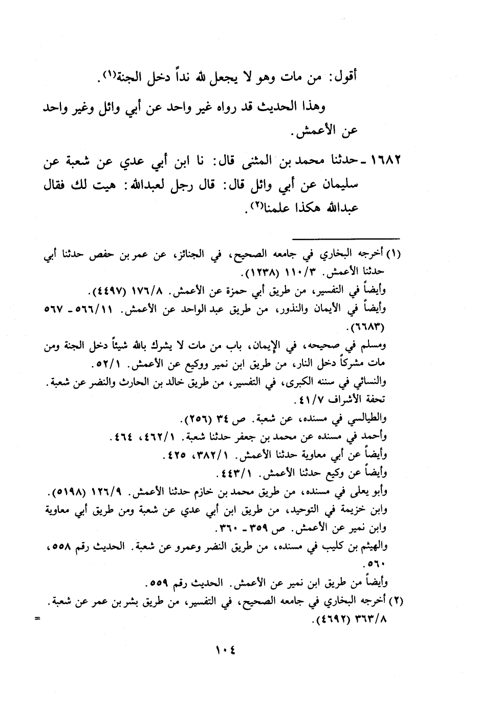 1682 - حَدَّثَنَا مُحَمَّدُ بْنُ الْمُثَنَّى، قَالَ: نا ابْنُ أَبِي عَدِيٍّ، عَنْ شُعْبَةَ، عَنْ سُلَيْمَانَ، عَنْ أَبِي وَائِلٍ قَالَ: قَالَ رَجُلٌ لِعَبْدِ اللَّهِ: هَيْتَ لَكَ، فَقَالَ عَبْدُ اللَّهِ: «§هَكَذَا عُلِّمْنَا» -[105]-، وَهَذَا الْحَدِيثُ لَا نَعْلَمُ رَوَاهُ إِلَّا الْأَعْمَشُ، عَنْ أَبِي وَائِلٍ، عَنْ عَبْدِ اللَّهِ