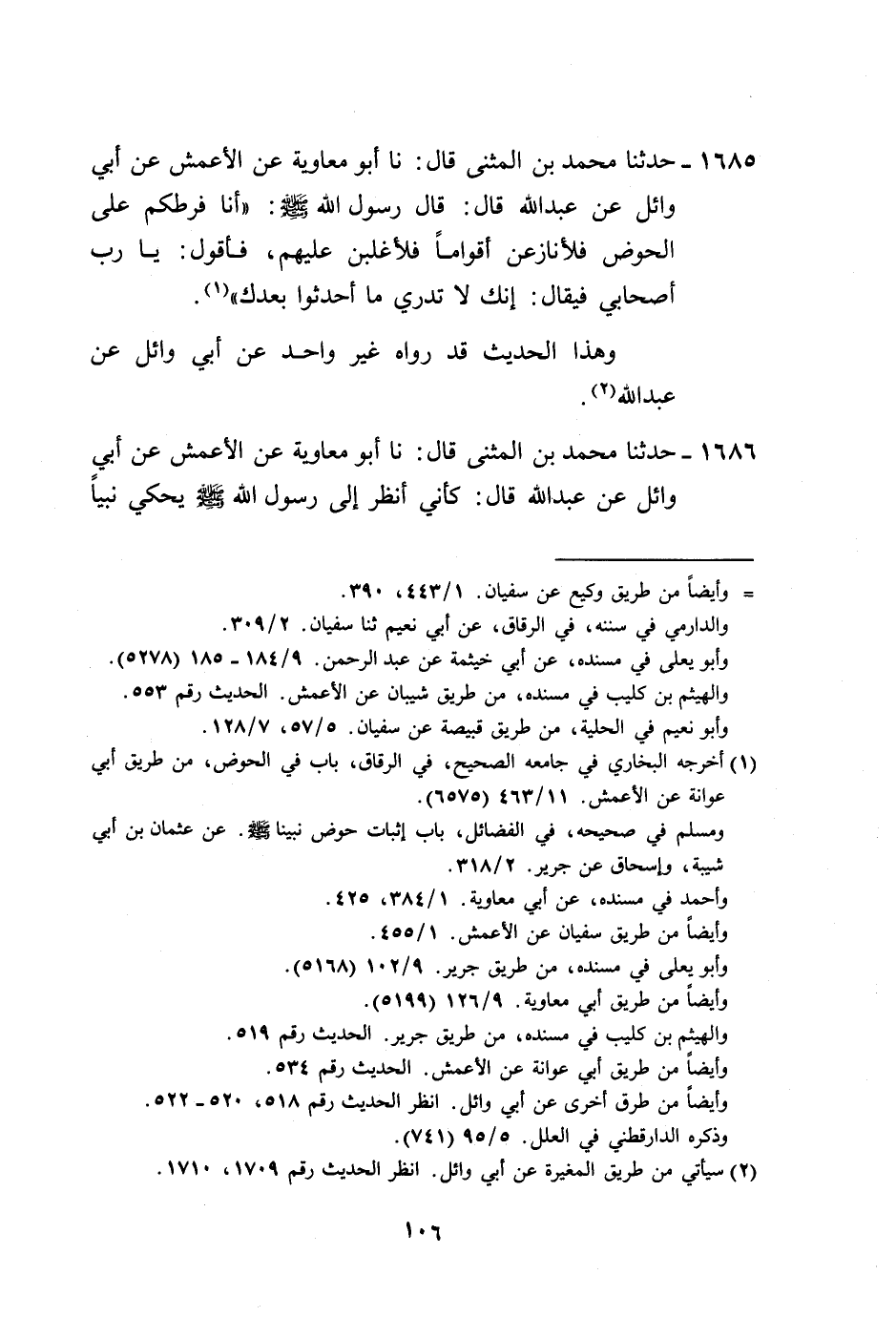 1685 - حَدَّثَنَا مُحَمَّدُ بْنُ الْمُثَنَّى، قَالَ: نا أَبُو مُعَاوِيَةَ، عَنِ الْأَعْمَشِ، عَنْ أَبِي وَائِلٍ، عَنْ عَبْدِ اللَّهِ قَالَ: قَالَ رَسُولُ اللَّهِ صَلَّى اللهُ عَلَيْهِ وَسَلَّمَ: " §أَنَا فَرَطُكُمُ عَلَى الْحَوْضِ، فَلَأُنَازِعَنَّ أَقْوَامًا فَلَأُغْلَبَنَّ عَلَيْهِمْ، فَأَقُولُ: يَا رَبِّ أَصْحَابِي، فَيُقَالُ: إِنَّكَ لَا تَدْرِي مَا أَحْدَثُوا بَعْدَكَ "، وَهَذَا الْحَدِيثُ قَدْ رَوَاهُ غَيْرُ وَاحِدٍ، عَنْ أَبِي وَائِلٍ، عَنْ عَبْدِ اللَّهِ