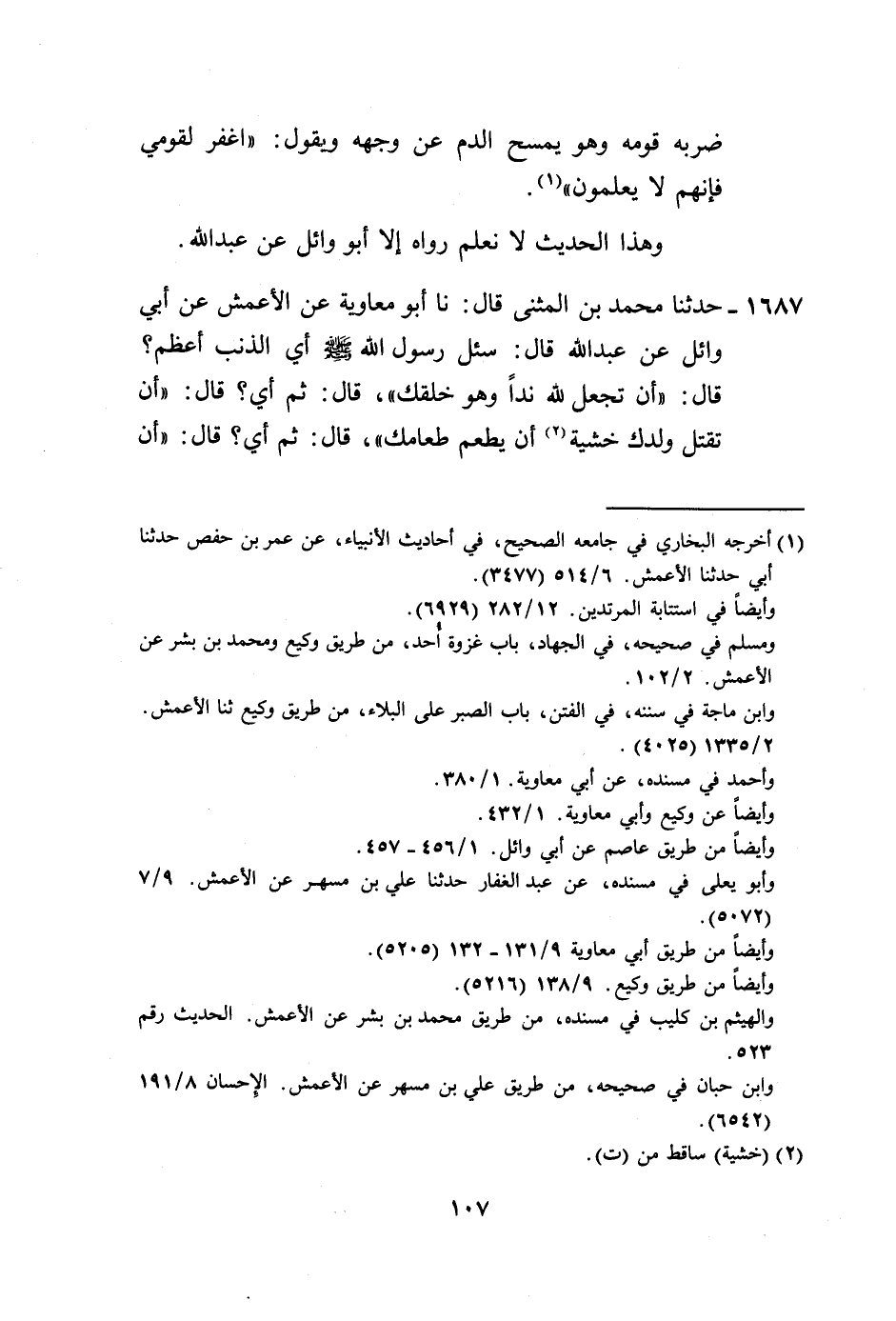 1687 - حَدَّثَنَا مُحَمَّدُ بْنُ الْمُثَنَّى، قَالَ: نا أَبُو مُعَاوِيَةَ، عَنِ الْأَعْمَشِ، عَنْ أَبِي وَائِلٍ، عَنْ عَبْدِ اللَّهِ قَالَ: سُئِلَ رَسُولُ اللَّهِ صَلَّى اللهُ عَلَيْهِ وَسَلَّمَ §أَيُّ الذَّنْبِ أَعْظَمُ؟ قَالَ: «أَنْ تَجْعَلَ لِلَّهِ نِدًّا وَهُوَ خَلَقَكَ» ، قَالَ: ثُمَّ أَيُّ؟ قَالَ: «أَنْ تَقْتُلَ وَلَدَكَ خَشْيَةَ أَنْ يَطْعَمَ طَعَامَكَ» ، قَالَ: ثُمَّ أَيُّ؟ قَالَ: «أَنْ -[108]- تُزَانِيَ بِحَلِيلَةِ جَارِكَ» ، ثُمَّ قَرَأَ {وَالَّذِينَ لَا يَدْعُونَ مَعَ اللَّهِ إِلَهًا آخَرَ وَلَا يَقْتُلُونَ النَّفْسَ الَّتِي} [الفرقان: 68] الْآيَةَ، وَهَذَا الْحَدِيثُ رَوَاهُ غَيْرُ أَبِي مُعَاوِيَةَ، عَنِ الْأَعْمَشِ، عَنْ أَبِي وَائِلٍ، عَنْ عَمْرِو بْنِ شُرَحْبِيلَ