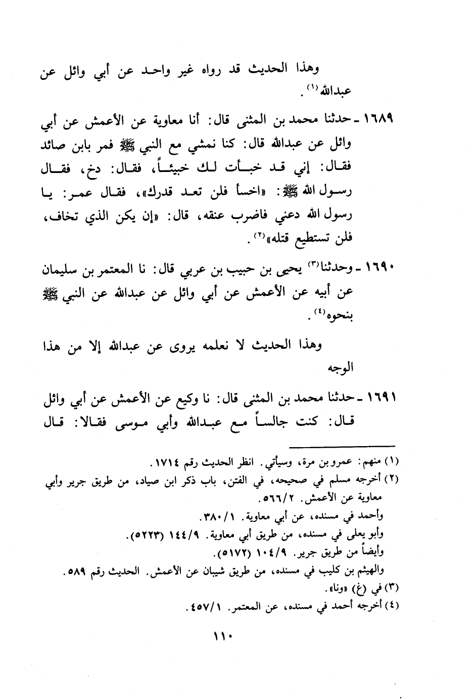 1690 - وَحَدَّثَنَا يَحْيَى بْنُ حَبِيبِ بْنِ عَرَبِيٍّ، قَالَ: نا الْمُعْتَمِرُ بْنُ سُلَيْمَانَ، عَنْ أَبِيهِ، عَنِ الْأَعْمَشِ، عَنْ أَبِي وَائِلٍ، عَنْ عَبْدِ اللَّهِ، عَنِ النَّبِيِّ صَلَّى اللهُ عَلَيْهِ وَسَلَّمَ، بِنَحْوِهِ، وَهَذَا الْحَدِيثُ لَا نَعْلَمُهُ يُرْوَى عَنْ عَبْدِ اللَّهِ إِلَّا مِنْ هَذَا الْوَجْهِ
