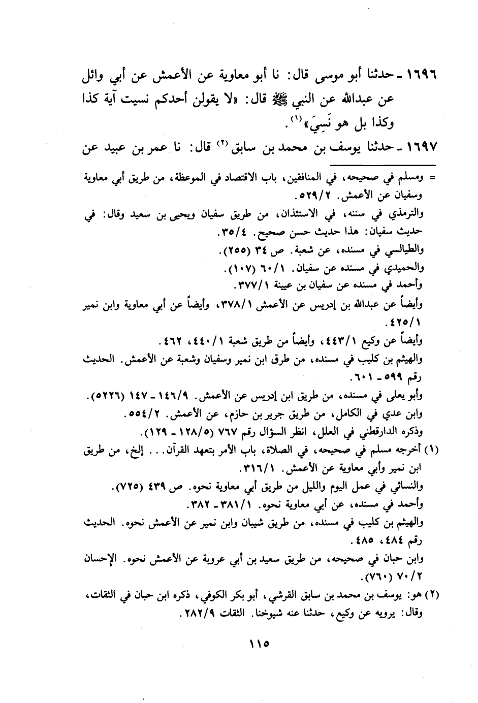 1696 - حَدَّثَنَا أَبُو مُوسَى، قَالَ: نا أَبُو مُعَاوِيَةَ، عَنِ الْأَعْمَشِ، عَنْ أَبِي وَائِلٍ، عَنْ عَبْدِ اللَّهِ، عَنِ النَّبِيِّ صَلَّى اللهُ عَلَيْهِ وَسَلَّمَ قَالَ: «§لَا يَقُولَنَّ أَحَدُكُمْ نَسِيتُ آيَةَ كَذَا وَكَذَا بَلْ هُوَ نُسِيَّ»