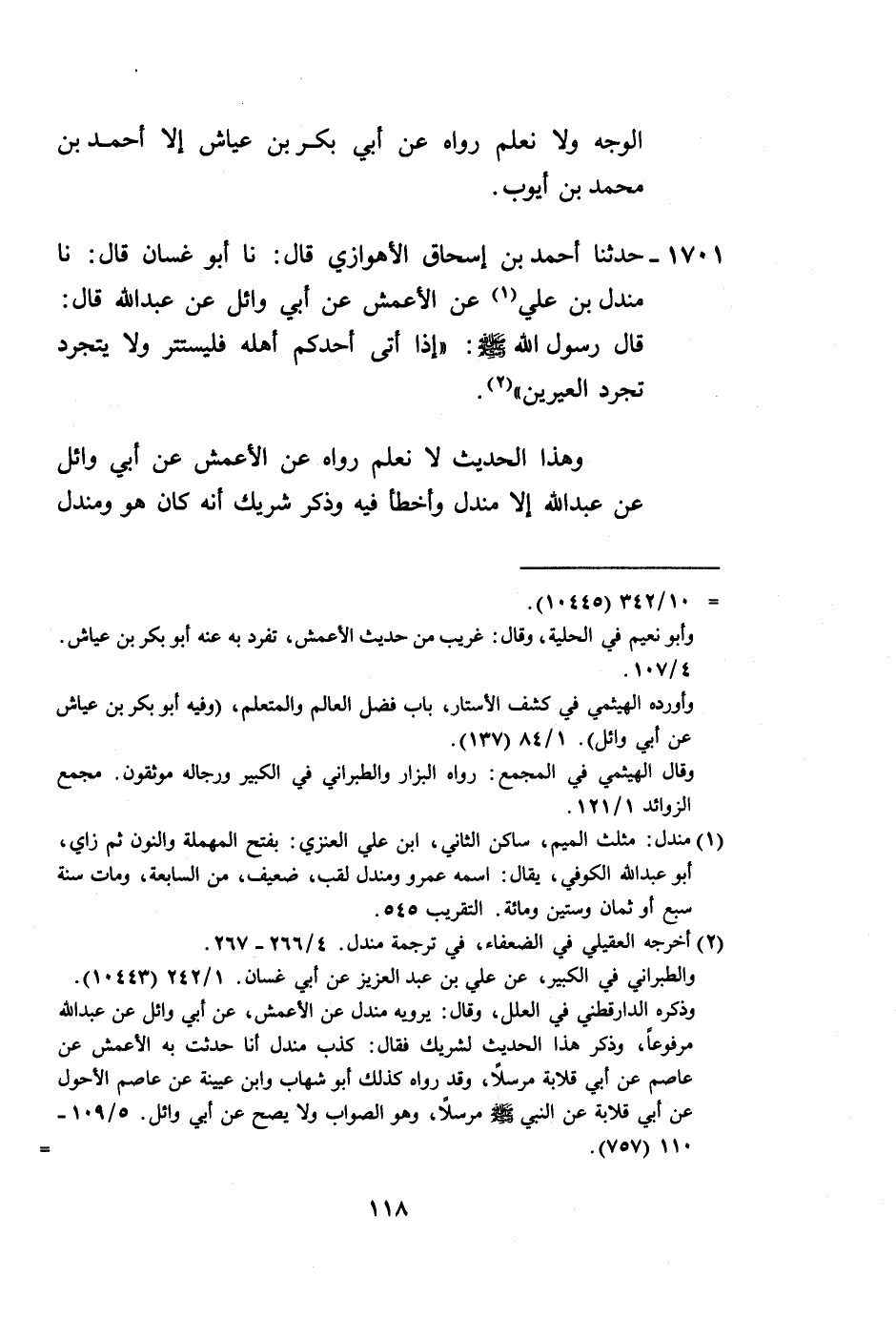 1701 - حَدَّثَنَا أَحْمَدُ بْنُ إِسْحَاقَ الْأَهْوَازِيُّ، قَالَ: نا أَبُو غَسَّانَ، قَالَ: نا مِنْدَلُ بْنُ عَلِيٍّ، عَنِ الْأَعْمَشِ، عَنْ أَبِي وَائِلٍ، عَنْ عَبْدِ اللَّهِ قَالَ: قَالَ رَسُولُ اللَّهِ صَلَّى اللهُ عَلَيْهِ وَسَلَّمَ: «§إِذَا أَتَى أَحَدُكُمْ أَهْلَهُ فَلْيَسْتَتِرْ وَلَا يَتَجَرَّدْ تَجَرُّدَ الْعَيْرَيْنِ» ، وَهَذَا الْحَدِيثُ لَا نَعْلَمُ رَوَاهُ عَنِ الْأَعْمَشِ، عَنْ أَبِي وَائِلٍ، عَنْ عَبْدِ اللَّهِ إِلَّا مِنْدَلُ وَأَخْطَأَ فِيهِ، وَذَكَرَ شَرِيكٌ أَنَّهُ كَانَ هُوَ وَمَنْدَلٌ -[119]- عِنْدَ الْأَعْمَشِ وَعِنْدَهُ عَاصِمُ الْأَحْوَلُ فَحَدَّثَ عَاصِمٌ، عَنْ أَبِي قِلَابَةَ، عَنِ النَّبِيِّ صَلَّى اللهُ عَلَيْهِ وَسَلَّمَ قَالَ: «إِذَا أَتَى أَحَدُكُمْ أَهْلَهُ» ، وَذَكَرَ الْحَدِيثَ مُرْسَلًا