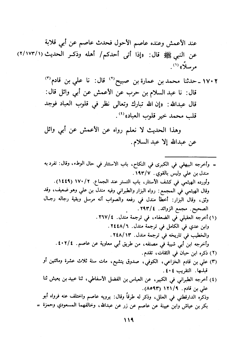 1702 - حَدَّثَنَا مُحَمَّدُ بْنُ عُمَارَةَ بْنِ صُبَيْحٍ، قَالَ: نا عَلِيُّ بْنُ قَادِمٍ، قَالَ: نا عَبْدُ السَّلَامِ بْنُ حَرْبٍ، عَنِ الْأَعْمَشِ، عَنْ أَبِي وَائِلٍ قَالَ: قَالَ عَبْدُ اللَّهِ: «إِنَّ §اللَّهَ تَبَارَكَ وَتَعَالَى نَظَرَ فِي قُلُوبِ الْعِبَادِ فَوَجَدَ قَلْبَ مُحَمَّدٍ خَيْرَ قُلُوبِ الْعِبَادِ» ، وَهَذَا الْحَدِيثُ لَا نَعْلَمُ رَوَاهُ عَنِ الْأَعْمَشِ، عَنْ أَبِي وَائِلٍ، عَنْ عَبْدِ اللَّهِ إِلَّا عَبْدُ السَّلَامِ