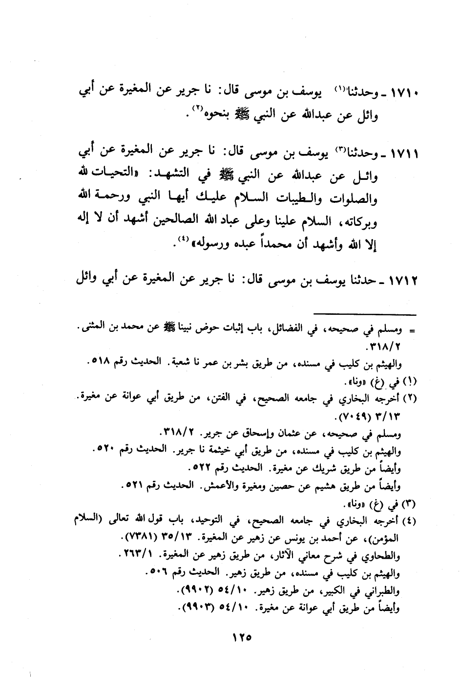 1711 - وَحَدَّثَنَا يُوسُفُ بْنُ مُوسَى، قَالَ: نا جَرِيرٌ، عَنِ الْمُغِيرَةِ، عَنْ أَبِي وَائِلٍ، عَنْ عَبْدِ اللَّهِ، عَنِ النَّبِيِّ صَلَّى اللهُ عَلَيْهِ وَسَلَّمَ فِي التَّشَهُّدِ: «§التَّحِيَّاتُ لِلَّهِ وَالصَّلَوَاتُ وَالطَّيِّبَاتُ، السَّلَامُ عَلَيْكَ أَيُّهَا النَّبِيُّ وَرَحْمَةُ اللَّهِ وَبَرَكَاتُهُ، السَّلَامُ عَلَيْنَا وَعَلَى عَبَّادِ اللَّهِ الصَّالِحِينَ، أَشْهَدُ أَنْ لَا إِلَهَ إِلَّا اللَّهُ، وَأَشْهَدُ أَنَّ مُحَمَّدًا عَبْدُهُ وَرَسُولُهُ»