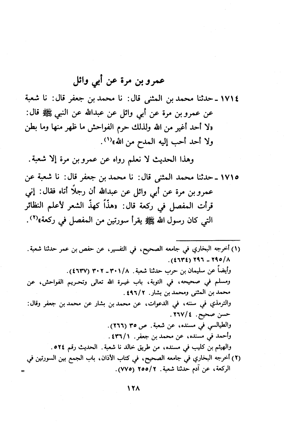 1715 - حَدَّثَنَا مُحَمَّدُ بْنُ الْمُثَنَّى، قَالَ: نا مُحَمَّدُ بْنُ جَعْفَرٍ، قَالَ: نا شُعْبَةُ، عَنْ عَمْرِو بْنِ مُرَّةَ، عَنْ أَبِي وَائِلٍ، عَنْ عَبْدِ اللَّهِ، أَنَّ رَجُلًا أَتَاهُ فَقَالَ: إِنِّي قَرَأْتُ الْمُفَصَّلَ فِي رَكْعَةٍ، قَالَ: «هَذًّا كَهَذِّ الشِّعْرِ، إِنِّي لَأَعْلَمُ §النَّظَائِرَ الَّتِي كَانَ رَسُولُ اللَّهِ صَلَّى اللهُ عَلَيْهِ وَسَلَّمَ يَقْرَأُ سُورَتَيْنِ مِنَ الْمُفَصَّلِ فِي رَكْعَةٍ» -[129]-، وَهَذَا الْحَدِيثُ لَا نَعْلَمُ رَوَاهُ عَنْ عَمْرِو بْنِ مُرَّةَ، عَنْ أَبِي وَائِلٍ، عَنْ عَبْدِ اللَّهِ إِلَّا شُعْبَةُ