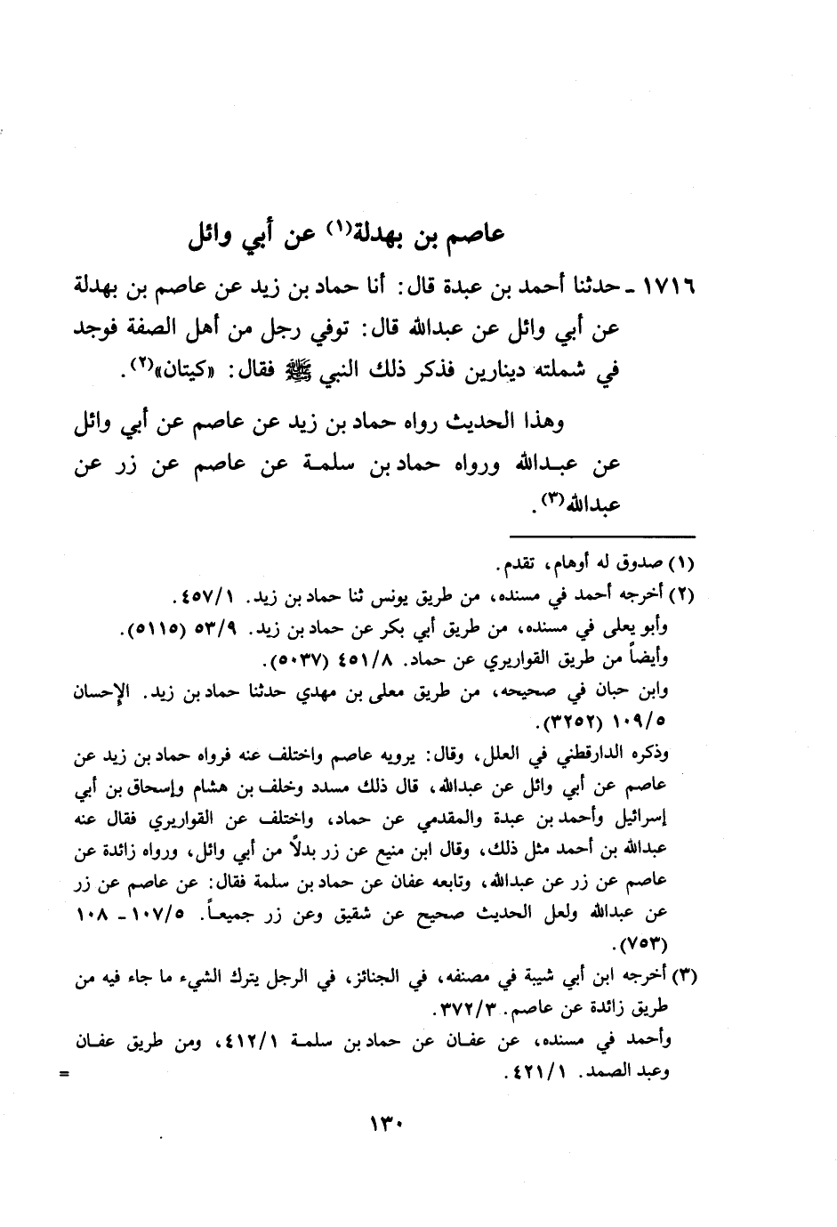 1716 - حَدَّثَنَا أَحْمَدُ بْنُ عَبْدَةَ، قَالَ: أنَا حَمَّادُ بْنُ زَيْدٍ، عَنْ عَاصِمِ بْنِ بَهْدَلَةَ، عَنْ أَبِي وَائِلٍ، عَنْ عَبْدِ اللَّهِ قَالَ: تُوُفِّيَ رَجُلٌ مِنْ أَهْلِ الصُّفَّةِ فَوَجَدَ فِي شَمْلَتِهِ دِينَارَيْنِ، فَذَكَرَ ذَلِكَ النَّبِيُّ صَلَّى اللهُ عَلَيْهِ وَسَلَّمَ فَقَالَ: «§كَيَّتَانِ» ، وَهَذَا الْحَدِيثُ رَوَاهُ حَمَّادُ بْنُ زَيْدٍ، عَنْ عَاصِمٍ، عَنْ أَبِي وَائِلٍ، عَنْ عَبْدِ اللَّهِ، وَرَوَاهُ حَمَّادُ بْنُ سَلَمَةَ، عَنْ عَاصِمٍ، عَنْ زِرٍّ، عَنْ عَبْدِ اللَّهِ