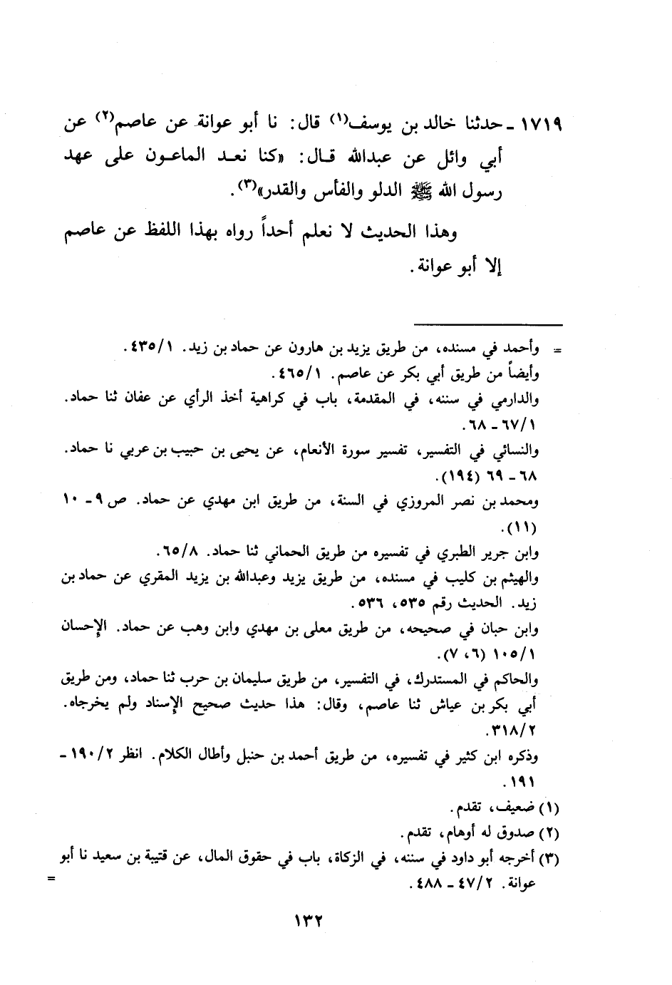 1719 - حَدَّثَنَا خَالِدُ بْنُ يُوسُفَ، قَالَ: نا أَبُو عَوَانَةَ، عنْ، عَاصِمٍ، عَنْ أَبِي وَائِلٍ، عَنْ عَبْدِ اللَّهِ قَالَ: «§كُنَّا نَعُدُّ الْمَاعُونَ عَلَى عَهْدِ رَسُولِ اللَّهِ صَلَّى اللهُ عَلَيْهِ وَسَلَّمَ الدَّلْوَ، وَالْفَأْسَ، وَالْقِدْرَ» ، وَهَذَا الْحَدِيثُ لَا نَعْلَمُ أَحَدًا رَوَاهُ بِهَذَا اللَّفْظِ، عَنْ عَاصِمٍ إِلَّا أَبُو عَوَانَةَ