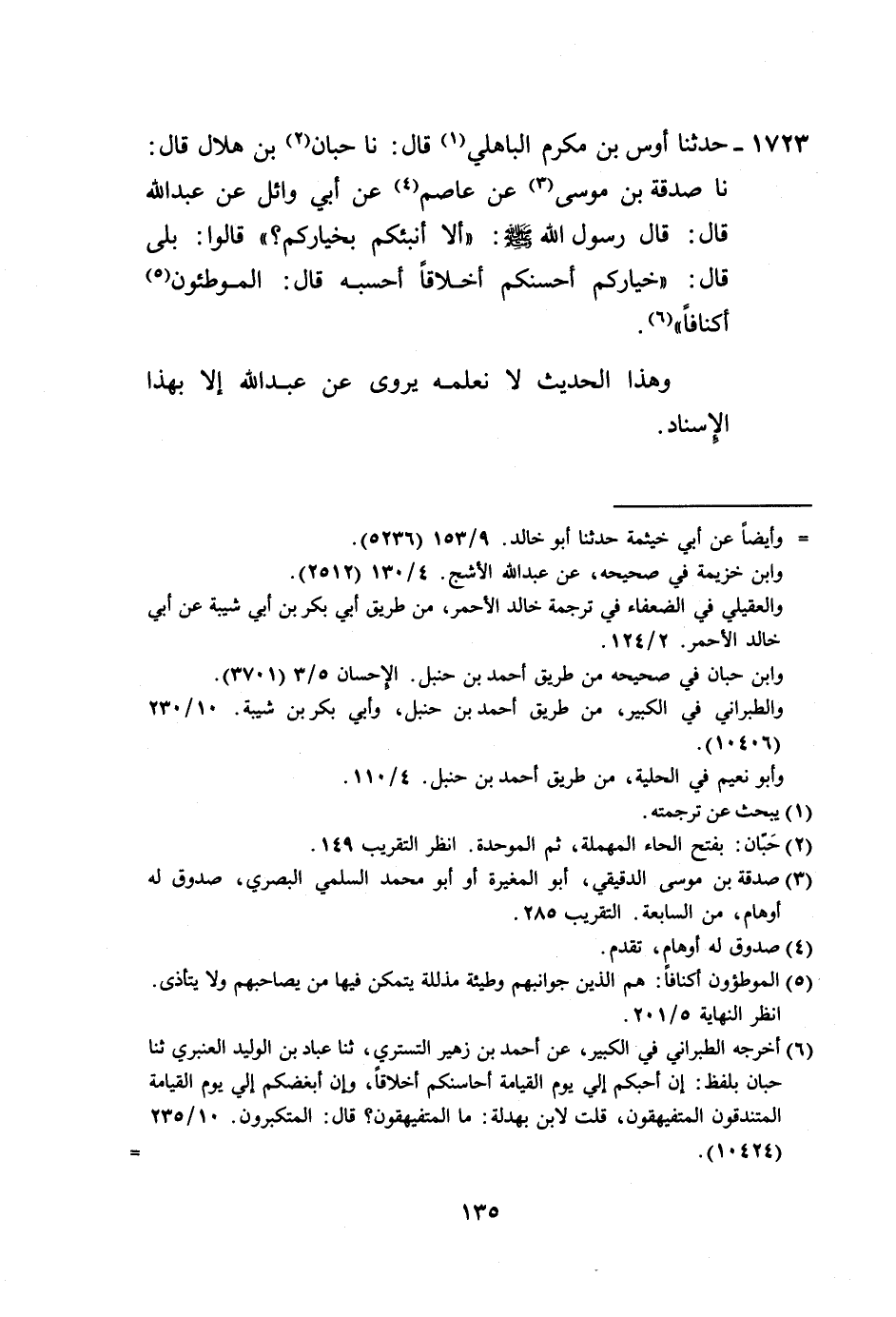 1723 - حَدَّثَنَا أَوْسُ بْنُ مُكْرَمٍ الْبَاهِلِيُّ، قَالَ: نا حَبَّانُ بْنُ هِلَالٍ، قَالَ: نا صَدَقَةُ بْنُ مُوسَى، عَنْ عَاصِمٍ، عَنْ أَبِي وَائِلٍ، عَنْ عَبْدِ اللَّهِ قَالَ: قَالَ رَسُولُ اللَّهِ صَلَّى اللهُ عَلَيْهِ وَسَلَّمَ: «أَلَا أُنَبِّئُكُمْ بِخِيَارِكُمْ؟» ، قَالُوا: بَلَى، قَالَ: " §خِيَارُكُمْ أَحْسَنُكُمْ أَخْلَاقًا ـ أَحْسَبُهُ قَالَ: الْمُوَطَّئُونَ أَكْنَافًا "، وَهَذَا الْحَدِيثُ لَا نَعْلَمُهُ يُرْوَى عَنْ عَبْدِ اللَّهِ إِلَّا بِهَذَا الْإِسْنَادِ