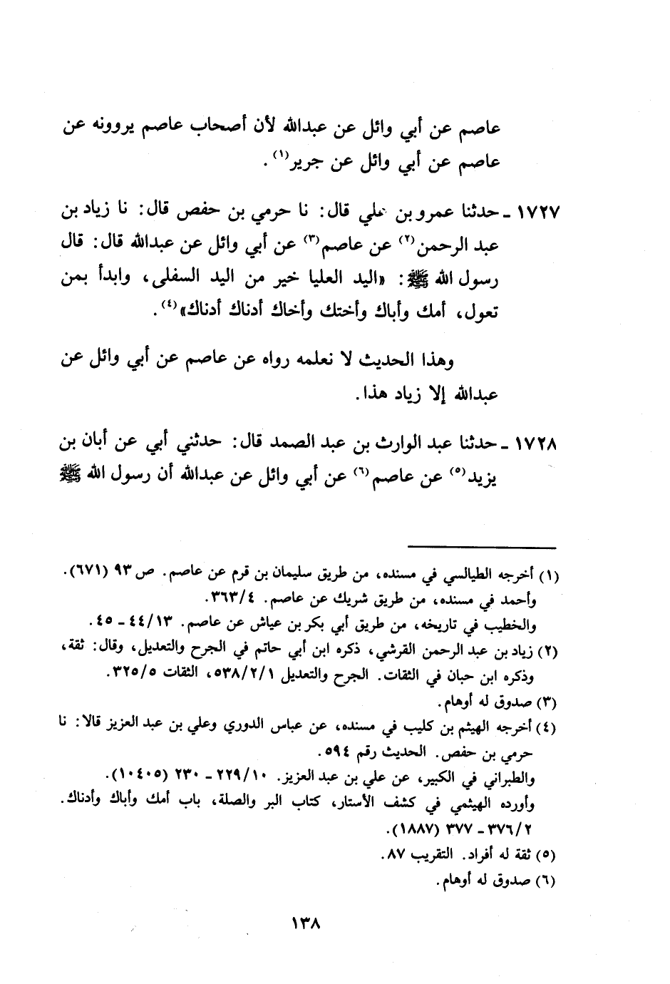 1727 - حَدَّثَنَا عَمْرُو بْنُ عَلِيٍّ، قَالَ: نا حَرَمِيُّ بْنُ حَفْصٍ، قَالَ: نا زِيَادُ بْنُ عَبْدِ الرَّحْمَنِ، عَنْ عَاصِمٍ، عَنْ أَبِي وَائِلٍ، عَنْ عَبْدِ اللَّهِ قَالَ: قَالَ رَسُولُ اللَّهِ صَلَّى اللهُ عَلَيْهِ وَسَلَّمَ: «§الْيَدُ الْعُلْيَا خَيْرٌ مِنَ الْيَدِ السُّفْلَى، وَابْدَأْ بِمَنْ تَعُولُ أُمَّكَ وَأَبَاكَ وَأُخْتَكَ وَأَخَاكَ أَدْنَاكَ أَدْنَاكَ» ، وَهَذَا الْحَدِيثُ لَا نَعْلَمُهُ رَوَاهُ عَنْ عَاصِمٍ، عَنْ أَبِي وَائِلٍ، عَنْ عَبْدِ اللَّهِ إِلَّا زِيَادٌ هَذَا