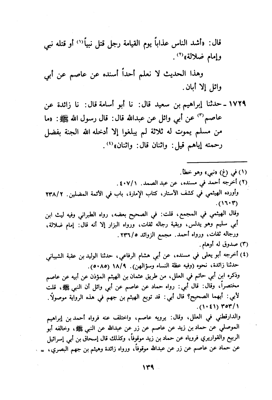 1729 - حَدَّثَنَا إِبْرَاهِيمُ بْنُ سَعِيدٍ، قَالَ: نا أَبُو أُسَامَةَ، قَالَ: قَالَ: نا زَائِدَةُ، عَنْ عَاصِمٍ، عَنْ أَبِي وَائِلٍ، عَنْ عَبْدِ اللَّهِ قَالَ: قَالَ رَسُولُ اللَّهِ صَلَّى اللهُ عَلَيْهِ وَسَلَّمَ: «§مَا مِنْ مُسْلِمٍ يَمُوتُ لَهُ ثَلَاثَةٌ لَمْ يَبْلُغُوا إِلَّا أَدْخَلَهُ اللَّهُ الْجَنَّةَ بِفَضْلِ رَحْمَتِهِ إِيَّاهُمْ» ، قِيلَ: وَاثْنَانِ؟ قَالَ: «وَاثْنَانِ» -[140]-، وَهَذَا الْحَدِيثُ قَدْ رَوَاهُ زَائِدَةُ، وَرَوَاهُ عَبْدُ الصَّمَدِ، عَنْ حَمَّادِ بْنِ سَلَمَةَ