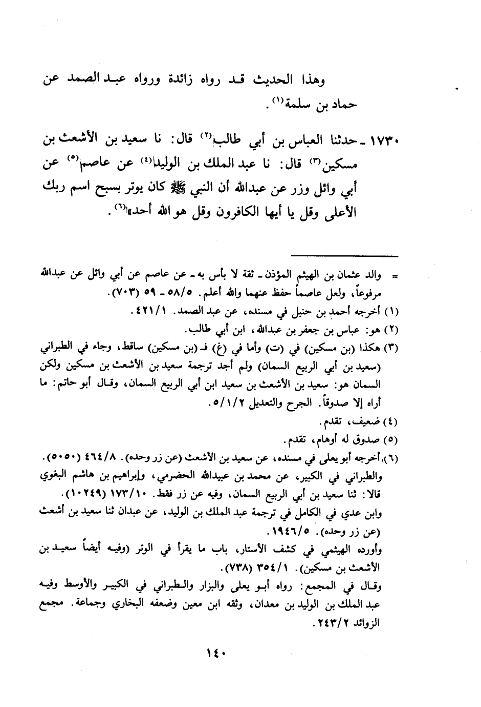 1730 - حَدَّثَنَا الْعَبَّاسُ بْنُ أَبِي طَالِبٍ، قَالَ: نا سَعِيدُ بْنُ الْأَشْعَثَ بْنِ مِسْكِينٍ، قَالَ: نا عَبْدُ الْمَلِكِ بْنُ الْوَلِيدِ، عَنْ عَاصِمٍ، عَنْ أَبِي وَائِلٍ، وَزِرٍّ، عَنْ عَبْدِ اللَّهِ، «أَنَّ النَّبِيَّ صَلَّى اللهُ عَلَيْهِ وَسَلَّمَ كَانَ §يُوتِرُ بِسَبِّحِ اسْمَ رَبِّكَ الْأَعْلَى، وَقُلْ يَا أَيُّهَا الْكَافِرُونُ، وَقُلْ هُوَ اللَّهُ أَحَدٌ»