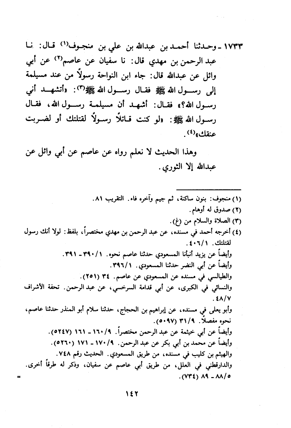 1733 - وَحَدَّثَنَا أَحْمَدُ بْنُ عَبْدِ اللَّهِ بْنِ عَلِيِّ بْنِ مَنْجُوفٍ، قَالَ: نا عَبْدُ الرَّحْمَنِ بْنُ مَهْدِيٍّ، قَالَ: نا سُفْيَانُ، عَنْ عَاصِمٍ، عَنْ أَبِي وَائِلٍ، عَنْ عَبْدِ اللَّهِ قَالَ: جَاءَ ابْنُ النَّوَّاحَةَ رَسُولًا مِنْ عِنْدِ مُسَيْلِمَةَ إِلَى رَسُولِ اللَّهِ صَلَّى اللهُ عَلَيْهِ وَسَلَّمَ فَقَالَ رَسُولُ اللَّهِ صَلَّى اللهُ عَلَيْهِ وَسَلَّمَ: «§أَتَشْهَدُ أَنِّي رَسُولُ اللَّهِ؟» ، فَقَالَ: أَشْهَدُ أَنَّ مُسَيْلِمَةَ رَسُولُ اللَّهِ، فَقَالَ رَسُولُ اللَّهِ صَلَّى اللهُ عَلَيْهِ وَسَلَّمَ: «لَوْ كُنْتُ قَاتِلًا رَسُولًا لَقَتَلْتُكَ أَوْ لَضَرَبْتُ عُنُقَكَ» ، وَهَذَا الْحَدِيثُ لَا نَعْلَمُ رَوَاهُ عَنْ عَاصِمٍ، عَنْ أَبِي وَائِلٍ، عَنْ عَبْدِ اللَّهِ إِلَّا الثَّوْرِيُّ