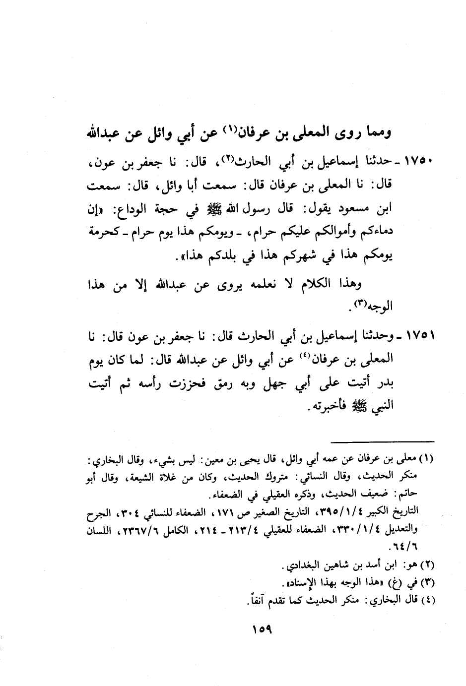 1750 - حَدَّثَنَا إِسْمَاعِيلُ بْنُ أَبِي الْحَارِثِ، قَالَ: نا جَعْفَرُ بْنُ عَوْنٍ، قَالَ: نا الْمُعَلَّى بْنُ عُرْفَانَ، قَالَ: سَمِعْتُ أَبَا وَائِلٍ قَالَ: سَمِعْتُ ابْنَ مَسْعُودٍ يَقُولُ: قَالَ رَسُولُ اللَّهِ صَلَّى اللهُ عَلَيْهِ وَسَلَّمَ فِي حَجَّةِ الْوَدَاعِ: «إِنَّ §دِمَاءَكُمْ وَأَمْوَالَكُمْ عَلَيْكُمْ حَرَامٌ ـ وَيَوْمَكُمْ هَذَا يَوْمٌ حَرَامٌ ـ كَحُرْمَةِ يَوْمِكُمْ هَذَا فِي شَهْرِكُمْ هَذَا فِي بَلَدِكُمْ هَذَا» ، وَهَذَا الْكَلَامُ لَا نَعْلَمُهُ يُرْوَى عَنْ عَبْدِ اللَّهِ إِلَّا مِنْ هَذَا الْوَجْهِ