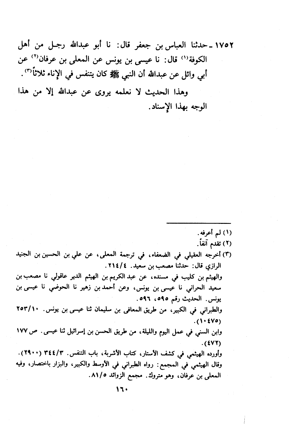 1752 - حَدَّثَنَا الْعَبَّاسُ بْنُ جَعْفَرٍ، قَالَ: نا أَبُو عَبْدِ اللَّهِ، رَجُلٌ مِنْ أَهْلِ الْكُوفَةِ، قَالَ: نَا عِيسَى بْنُ يُونُسَ، عَنِ الْمُعَلَّى بْنِ عُرْفَانَ، عَنْ أَبِي وَائِلٍ، عَنْ عَبْدِ اللَّهِ، «أَنَّ النَّبِيَّ صَلَّى اللهُ عَلَيْهِ وَسَلَّمَ كَانَ §يَتَنَفَّسُ فِي الْإِنَاءِ ثَلَاثًا» ، وَهَذَا الْحَدِيثُ لَا نَعْلَمُهُ يُرْوَى عَنْ عَبْدِ اللَّهِ إِلَّا مِنْ هَذَا الْوَجْهِ بِهَذَا الْإِسْنَادِ