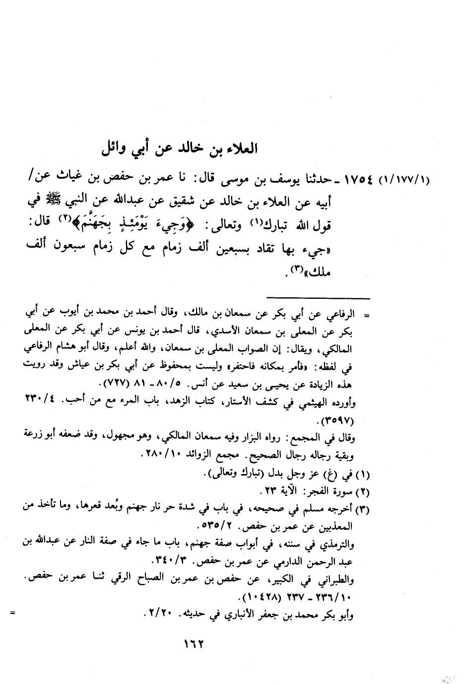 1754 - حَدَّثَنَا يُوسُفُ بْنُ مُوسَى، قَالَ: نا عُمَرُ بْنُ حَفْصِ بْنِ غِيَاثٍ، عَنْ أَبِيهِ، عَنِ الْعَلَاءِ بْنِ خَالِدٍ، عَنْ شَقِيقٍ، عَنْ عَبْدِ اللَّهِ، عَنِ النَّبِيِّ صَلَّى اللهُ عَلَيْهِ وَسَلَّمَ فِي قَوْلِ اللَّهِ تَبَارَكَ وَتَعَالَى: {§وَجِيءَ يَوْمَئِذٍ بِجَهَنَّمَ} [الفجر: 23] ، قَالَ: «جِيءَ بِهَا تُقَادُ بِسَبْعِينَ أَلْفَ زِمَامٍ مَعَ كُلِّ زِمَامٍ سَبْعُونَ أَلْفَ مَلَكٍ» -[163]-،