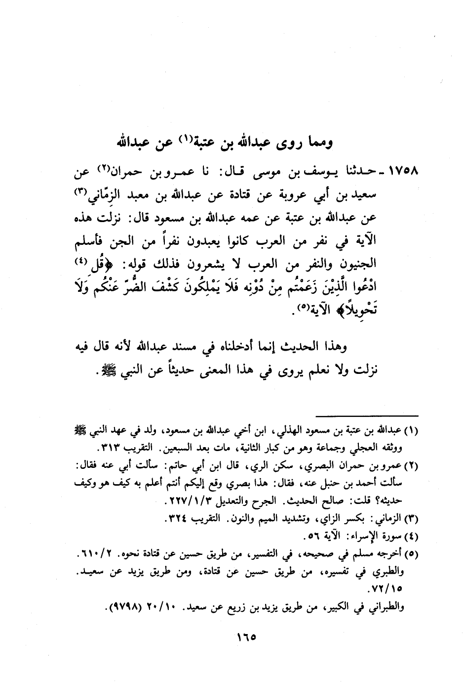 1758 - حَدَّثَنَا يُوسُفُ بْنُ مُوسَى، قَالَ: نا عَمْرُو بْنُ حُمْرَانَ، عَنْ سَعِيدِ بْنِ أَبِي عَرُوبَةَ، عَنْ قَتَادَةَ، عَنْ عَبْدِ اللَّهِ بْنِ مَعْبَدٍ الزِّمَّانِيِّ، عَنْ عَبْدِ اللَّهِ بْنِ عُتْبَةَ، عَنْ عَمِّهِ عَبْدِ اللَّهِ بْنِ مَسْعُودٍ قَالَ: نَزَلَتْ هَذِهِ الْآيَةُ فِي نَفَرٍ مِنَ الْعَرَبِ كَانُوا يَعْبُدُونَ نَفَرًا مِنَ الْجِنِّ فَأَسْلَمَ الْجِنِّيُّونَ وَالنَّفَرُ مِنَ الْعَرَبِ لَا يَشْعُرُونَ فَذَلِكَ قَوْلُهُ: " {§قُلِ ادْعُوا الَّذِينَ زَعَمْتُمْ مِنْ دُونِهِ فَلَا يَمْلِكُونَ كَشْفَ الضُّرِّ عَنْكُمْ وَلَا تَحْوِيلًا} [الإسراء: 56] "، الْآيَةَ، وَهَذَا الْحَدِيثُ إِنَّمَا أَدْخَلْنَاهُ فِي مُسْنَدِ عَبْدِ اللَّهِ لِأَنَّهُ قَالَ: فِيهِ نَزَلَتْ، وَلَا نَعْلَمُ يُرْوَى فِي هَذَا الْمَعْنَى حَدِيثًا، عَنِ النَّبِيِّ صَلَّى اللهُ عَلَيْهِ وَسَلَّمَ