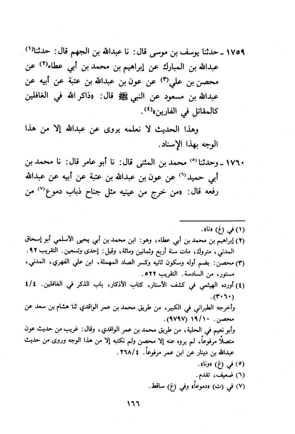 1759 - حَدَّثَنَا يُوسُفُ بْنُ مُوسَى، قَالَ: نا عَبْدُ اللَّهِ بْنُ الْجَهْمِ، قَالَ: حَدَّثَنَا عَبْدُ اللَّهِ بْنُ الْمُبَارَكِ، عَنْ إِبْرَاهِيمَ بْنِ مُحَمَّدِ بْنِ أَبِي عَطَاءٍ، عَنْ مِحْصَنِ بْنِ عَلِيٍّ، عَنْ عَوْنِ بْنِ عَبْدِ اللَّهِ بْنِ عُتْبَةَ، عَنْ أَبِيهِ، عَنْ عَبْدِ اللَّهِ بْنِ مَسْعُودٍ، عَنِ النَّبِيِّ صَلَّى اللهُ عَلَيْهِ وَسَلَّمَ قَالَ: «§ذَاكِرُ اللَّهِ فِي الْغَافِلِينَ كَالْمُقَاتِلِ فِي الْفَارِّينَ» ، وَهَذَا الْحَدِيثُ لَا نَعْلَمُهُ يُرْوَى عَنْ عَبْدِ اللَّهِ إِلَّا مِنْ هَذَا الْوَجْهِ بِهَذَا الْإِسْنَادِ