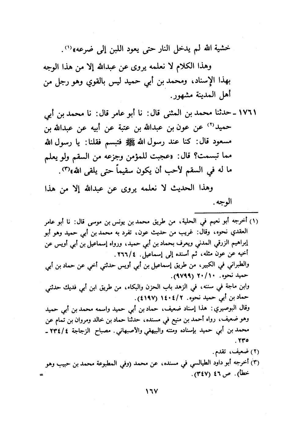 1761 - حَدَّثَنَا مُحَمَّدُ بْنُ الْمُثَنَّى، قَالَ: نا أَبُو عَامِرٍ، قَالَ: نا مُحَمَّدُ بْنُ أَبِي حُمَيْدٍ، عَنْ عَوْنِ بْنِ عَبْدِ اللَّهِ بْنِ عُتْبَةَ، عَنْ أَبِيهِ، عَنْ عَبْدِ اللَّهِ بْنِ مَسْعُودٍ قَالَ: كُنَا عِنْدَ رَسُولِ اللَّهِ صَلَّى اللهُ عَلَيْهِ وَسَلَّمَ فَتَبَسَّمَ، فَقُلْنَا: يَا رَسُولَ اللَّهِ، مِمَّا تَبَسَّمْتَ؟ قَالَ: «§عَجِبْتُ لِلْمُؤْمِنِ وَجَزَعِهِ مِنَ السَّقَمِ، وَلَوْ يَعْلَمُ مَا لَهُ فِي السَّقَمِ لَأَحَبَّ أَنْ يَكُونَ سَقِيمًا حَتَّى يَلْقَى اللَّهَ» ، وَهَذَا الْحَدِيثُ لَا نَعْلَمُهُ يُرْوَى عَنْ عَبْدِ اللَّهِ إِلَّا مِنْ هَذَا الْوَجْهِ