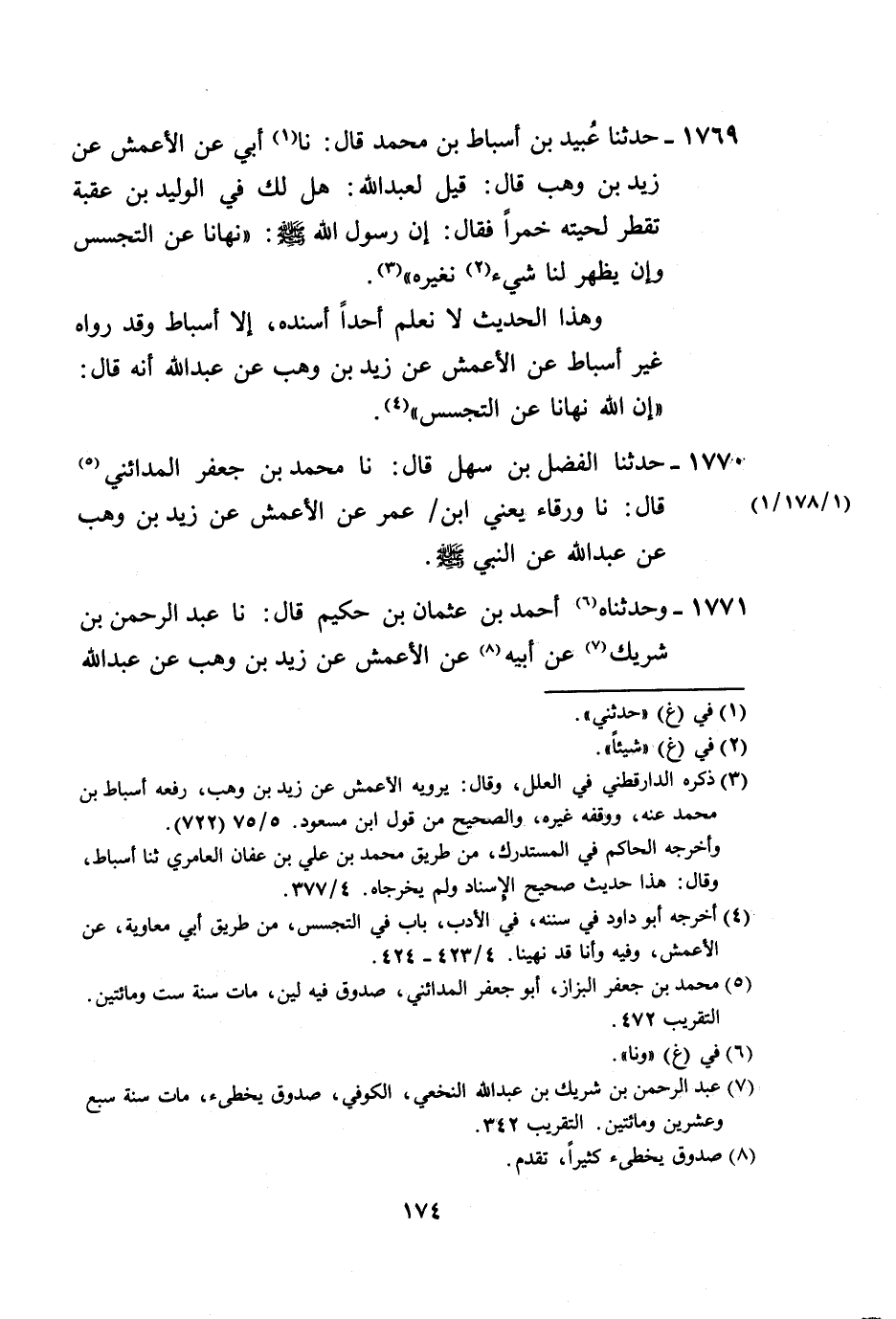 1769 - حَدَّثَنَا عُبَيْدُ بْنُ أَسْبَاطِ بْنِ مُحَمَّدٍ، قَالَ: نا أَبِي، عَنِ الْأَعْمَشِ، عَنْ زَيْدِ بْنِ وَهْبٍ قَالَ: قِيلَ لِعَبْدِ اللَّهِ: هَلْ لَكَ فِي الْوَلِيدِ بْنِ عُقْبَةَ تَقْطُرُ لِحْيَتُهُ خَمْرًا؟ فَقَالَ: «إِنَّ رَسُولَ اللَّهِ صَلَّى اللهُ عَلَيْهِ وَسَلَّمَ §نَهَانَا عَنِ التَّجَسُّسِ، وَإِنْ يَظْهَرْ لَنَا شَيْءٌ نُغَيِّرْهُ» وَهَذَا الْحَدِيثُ لَا نَعْلَمُ أَحَدًا أَسْنَدَهُ إِلَّا أَسْبَاطٌ وَقَدْ رَوَاهُ غَيْرُ أَسْبَاطٍ، عَنِ الْأَعْمَشِ، عَنْ زَيْدِ بْنِ وَهْبٍ، عَنْ عَبْدِ اللَّهِ أَنَّهُ قَالَ: «إِنَّ اللَّهَ نَهَانَا عَنِ التَّجَسُّسِ»