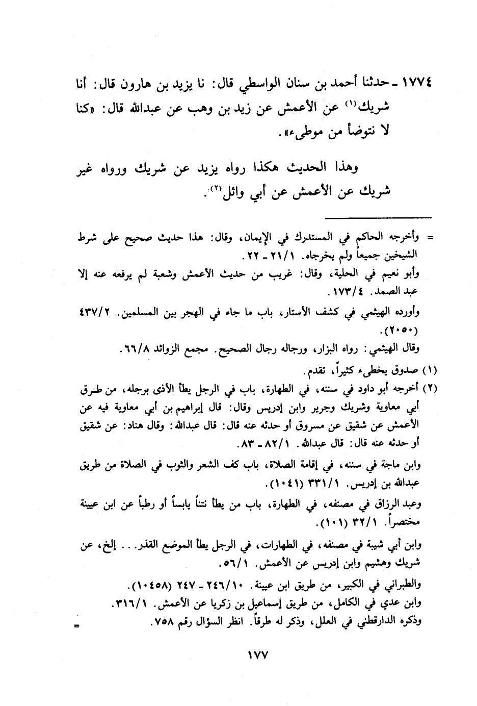 1774 - حَدَّثَنَا أَحْمَدُ بْنُ سِنَانٍ الْوَاسِطِيُّ، قَالَ: نا يَزِيدُ بْنُ هَارُونَ، قَالَ: أنَا شَرِيكٌ، عَنِ الْأَعْمَشِ، عَنْ زَيْدِ بْنِ وَهْبٍ، عَنْ عَبْدِ اللَّهِ قَالَ: «§كُنَّا لَا نَتَوَضَّأُ مِنْ مُوطَأِ» ، وَهَذَا الْحَدِيثُ هَكَذَا رَوَاهُ يَزِيدُ، عَنْ شَرِيكٍ، وَرَوَاهُ غَيْرُ شَرِيكٍ، عَنِ الْأَعْمَشِ، عَنْ أَبِي وَائِلٍ