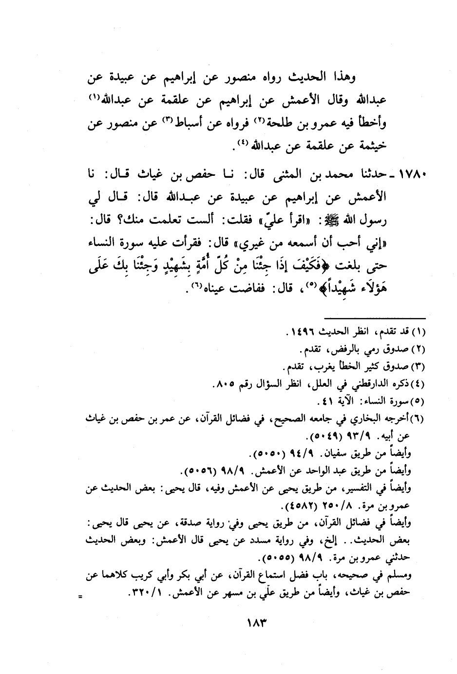 1780 - حَدَّثَنَا مُحَمَّدُ بْنُ الْمُثَنَّى، قَالَ: نا حَفْصُ بْنُ غِيَاثٍ، قَالَ: نا الْأَعْمَشُ، عَنْ إِبْرَاهِيمَ، عَنْ عُبَيْدَةَ، عَنْ عَبْدِ اللَّهِ قَالَ: قَالَ لِي رَسُولُ اللَّهِ صَلَّى اللهُ عَلَيْهِ وَسَلَّمَ: «اقْرَأْ عَلَيَّ» ، فَقُلْتُ: أَلَسْتُ تَعَلَّمْتُ مِنْكَ؟ قَالَ: «إِنِّي §أُحِبُّ أَنْ أَسْمَعَهُ مِنْ غَيْرِي» ، قَالَ: فَقَرَأْتُ عَلَيْهِ سُورَةَ النِّسَاءِ حَتَّى بَلَغْتُ {فَكَيْفَ إِذَا جِئْنَا مِنْ كُلِّ أُمَّةٍ بِشَهِيدٍ وَجِئْنَا بِكَ عَلَى هَؤُلَاءِ شَهِيدًا} [النساء: 41] ، قَالَ: فَفَاضْتَ عَيْنَاهُ -[184]-، وَهَذَا الْحَدِيثُ لَا نَعْلَمُهُ رَوَاهُ عَنْ إِبْرَاهِيمَ، عَنْ عُبَيْدَةَ، عَنْ عَبْدِ اللَّهِ إِلَّا الْأَعْمَشُ، وَقَدْ رَوَاهُ أَبُو الْأَحْوَصِ، وَالْمُفَضَّلُ بْنُ مُحَمَّدٍ، عَنِ الْأَعْمَشِ، عَنْ إِبْرَاهِيمَ، عَنْ عَلْقَمَةَ، عَنْ عَبْدِ اللَّهِ