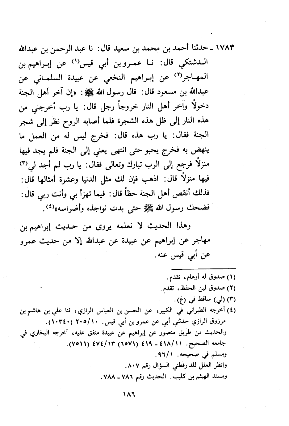 1783 - حَدَّثَنَا أَحْمَدُ بْنُ مُحَمَّدِ بْنِ سَعِيدٍ، قَالَ: نا عَبْدُ الرَّحْمَنِ بْنُ عَبْدِ اللَّهِ الدَّشْتَكِيُّ، قَالَ: نا عَمْرُو بْنُ أَبِي قَيْسٍ، عَنْ إِبْرَاهِيمَ بْنِ الْمُهَاجِرِ، عَنْ إِبْرَاهِيمَ النَّخَعِيِّ، عَنْ عَبِيدَةَ السَّلْمَانِيِّ، عَنْ عَبْدِ اللَّهِ بْنِ مَسْعُودٍ قَالَ: قَالَ رَسُولُ اللَّهِ صَلَّى اللهُ عَلَيْهِ وَسَلَّمَ: " إِنَّ §آخِرَ أَهْلِ الْجَنَّةِ دُخُولًا وَآخِرَ أَهْلِ النَّارِ خُرُوجًا رَجُلٌ قَالَ: يَا رَبِّ، أَخْرِجْنِي مِنْ هَذِهِ النَّارِ إِلَى ظِلِّ هَذِهِ الشَّجَرَةِ، فَلَمَّا أَصَابَهُ الرَّوْحُ نَظَرَ إِلَى شَجَرِ الْجَنَّةِ فَقَالَ: يَا رَبِّ هَذِهِ "، قَالَ: " فَخَرَجَ لَيْسَ لَهُ مِنَ الْعَمَلِ مَا يَنْهَضُ بِهِ، فَخَرَجَ يَحْبُو حَتَّى انْتَهَى ـ يَعْنِي إِلَى الْجَنَّةَ ـ فَلَمْ يَجِدْ فِيهَا مَنْزِلًا فَرَجَعَ إِلَى الرَّبِّ تَبَارَكَ وَتَعَالَى فَقَالَ: يَا رَبِّ، لَمْ أَجِدْ لِي فِيهَا مَنْزِلًا، قَالَ: اذْهَبْ فَإِنَّ لَكَ مِثْلَ الدُّنْيَا وَعَشَرَةَ أَمْثَالِهَا "، قَالَ: " فَذَلِكَ أَنْقُصُ أَهْلِ الْجَنَّةِ حَظًّا، قَالَ: فِيمَا تَهْزَأُ بِي وَأَنْتَ رَبِّي، قَالَ: «فَضَحِكَ رَسُولُ اللَّهِ صَلَّى اللهُ عَلَيْهِ وَسَلَّمَ حَتَّى بَدَتْ نَوَاجِذُهُ وَأَضْرَاسُهُ» ، وَهَذَا الْحَدِيثُ لَا نَعْلَمُهُ يُرْوَى مِنْ حَدِيثِ إِبْرَاهِيمَ بْنِ مُهَاجِرٍ، عَنْ إِبْرَاهِيمَ، عَنْ عُبَيْدَةَ، عَنْ عَبْدِ اللَّهِ إِلَّا مِنْ حَدِيثِ عَمْرٍو، عَنْ أَبِي قَيْسٍ عَنْهُ