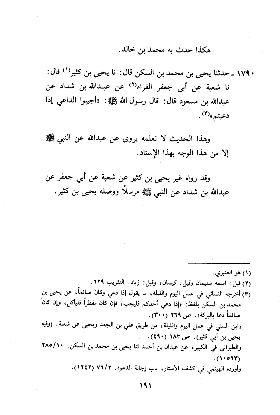 1790 - حَدَّثَنَا يَحْيَى بْنُ مُحَمَّدِ بْنِ السَّكَنِ، قَالَ: نا يَحْيَى بْنُ كَثِيرٍ، قَالَ: نا شُعْبَةُ، عَنْ أَبِي جَعْفَرٍ الْفَرَّاءِ، عَنْ عَبْدِ اللَّهِ بْنِ شَدَّادٍ، عَنْ عَبْدِ اللَّهِ بْنِ مَسْعُودٍ قَالَ: قَالَ رَسُولُ اللَّهِ صَلَّى اللهُ عَلَيْهِ وَسَلَّمَ: «§أَجِيبُوا الدَّاعِيَ إِذَا دُعِيتُمْ» ، وَهَذَا الْحَدِيثُ لَا نَعْلَمُهُ يُرْوَى عَنْ عَبْدِ اللَّهِ، عَنِ النَّبِيِّ صَلَّى اللهُ عَلَيْهِ وَسَلَّمَ إِلَّا مِنْ هَذَا الْوَجْهِ بِهَذَا الْإِسْنَادِ، وَقَدْ رَوَاهُ غَيْرُ يَحْيَى بْنِ كَثِيرٍ، عَنْ شُعْبَةَ، عَنْ أَبِي جَعْفَرٍ، عَنْ عَبْدِ اللَّهِ بْنِ شَدَّادٍ، عَنِ النَّبِيِّ صَلَّى اللهُ عَلَيْهِ وَسَلَّمَ مُرْسَلًا، وَوَصَلَهُ يَحْيَى بْنُ كَثِيرٍ